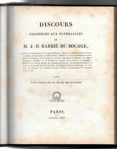 Discours prononcés aux funérailles de M. J.-D. BARBIE' DU BOCAGE, suivis d'une notice sur sa vie et ses ouvrages