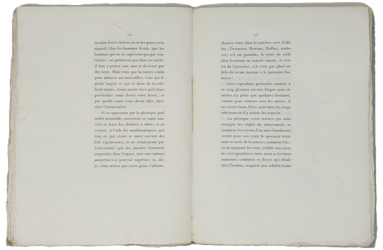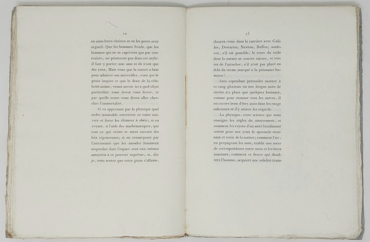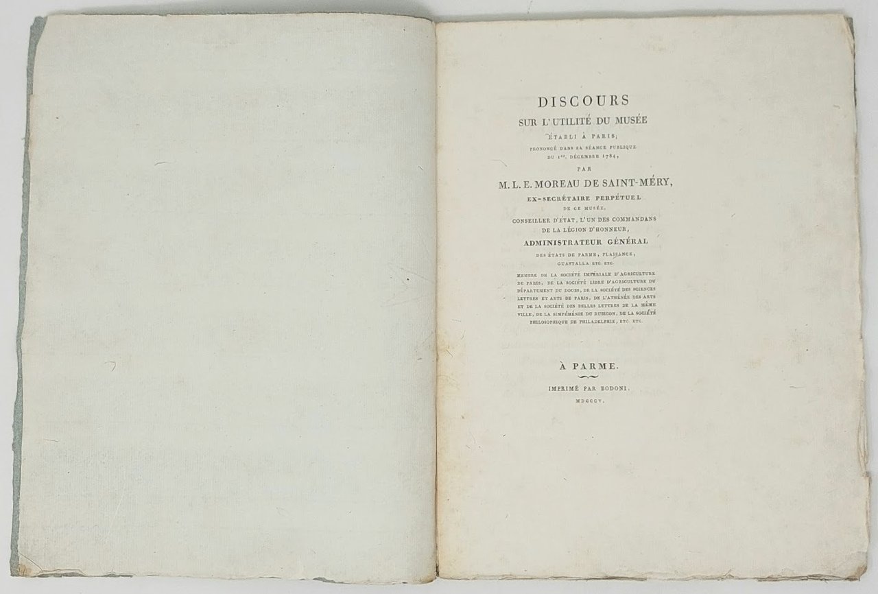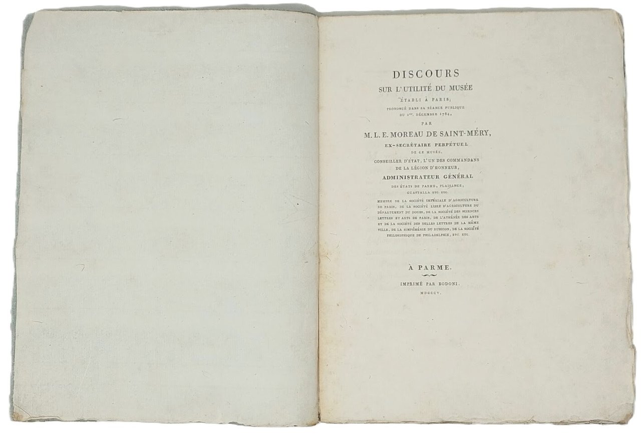 >in-4 piccolo (272x220 mm), pp. (8 di cui prime due bianche), 32; brossura muta. Prima edizione di questo pamphlet celebrativo composto da Saint-Méry in occasione dello spostamento nel 1782 del Museo Rozier nei più ampi locali di rue de Bons Enfants a Parigi. L'Autore fu nominato segretario del museo e tenne il presente discorso nel dicembre 1804. Il museo venne trasformato in un Liceo dopo la tragica scomparsa del suo fondatore nel 1785 in quello che è considerato il primo incidente aereo della storia. Moreau de Saint-Méry (1750-1819) fu giurista e politico francese, nominato nel 1802 da Napoleone Bonaparte amministratore dei ducati di Parma, Piacenza e Guastalla. Ottimo esemplare, a pieni margini, in barbe.
