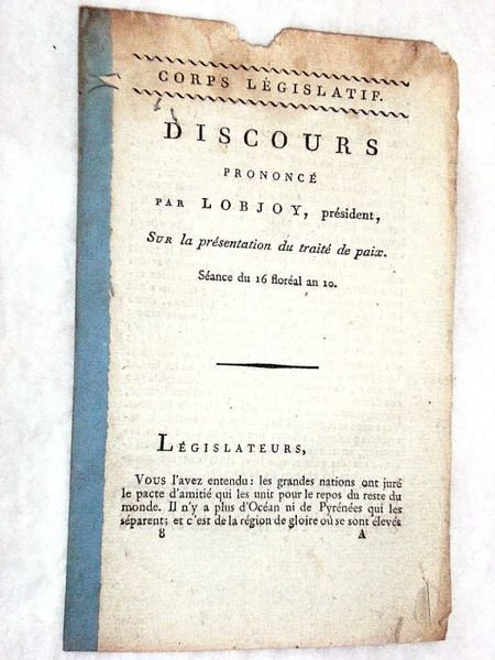 in-8. 3pp. Broché, dos renforcé. Petites mouillures et papier abîmé dans la marge supérieure. Petit accroc. Discours sur la promulgation du traité de paix entre la France et l'Angleterre.