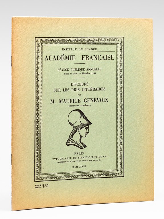 Discours sur les prix littéraires [ Livre dédicacé par Maurice Genevoix à Maurice Druon ] Séance publique annuelle tenue le jeudi 19 décembre 1968