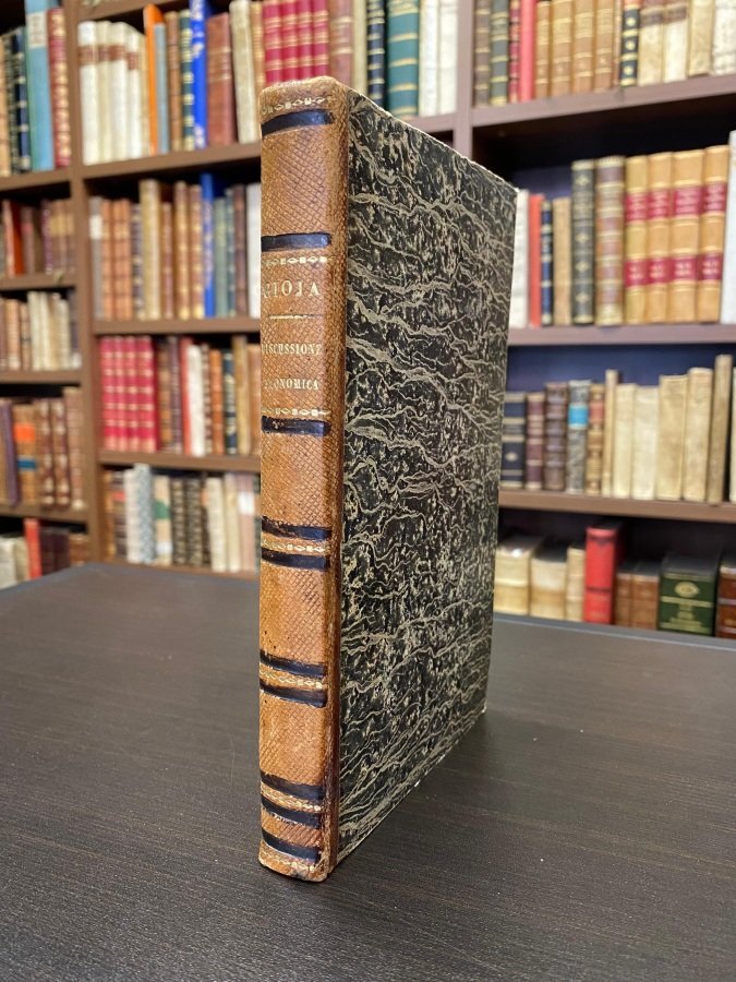 <span style="font-style: normal;">In-8° (cm. 20,5), legatura coeva in mezza pelle, dorso con titolo in oro e sobrie decorazioni in oro e nero; pp. [4] 175 con 2 tavole di tabelle ripiegate fuori testo; fioriture sparse. Bella riedizione di un titolo raro (Milano 1804), che offriva una prima </span>ragionata metodologia di analisi della società civile a uso della pubblica amministrazione. Q<span style="font-style: normal;">ui era inserito nella collana delle </span><i>Opere Minori</i> di Melchiorre Gioja pubblicata in 17 volumi tra il 1832 ed il 1837 dall'editore Ruggia di Lugano. Cfr. Einaudi 2575. Buon esemplare. (SO4)