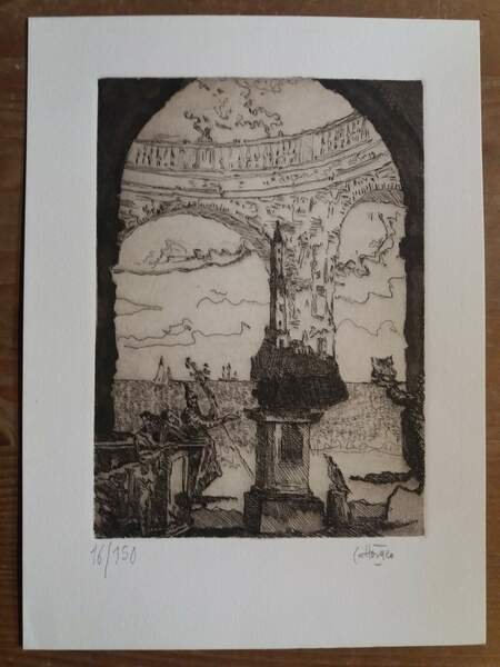 Brossura, sopraccoperta illustrata, cm. 28 x 21, pp.60. Con un’acquaforte acquatinta originale di Carlo Cattaneo, tirata su torchio a mano dalla Stamperia Ferrante di Via degli Specchi in Roma, firmata e numerata a matita dall’artista. Edizione di 150 copie numerate (n.16). Con illustrazioni. Prima edizione.