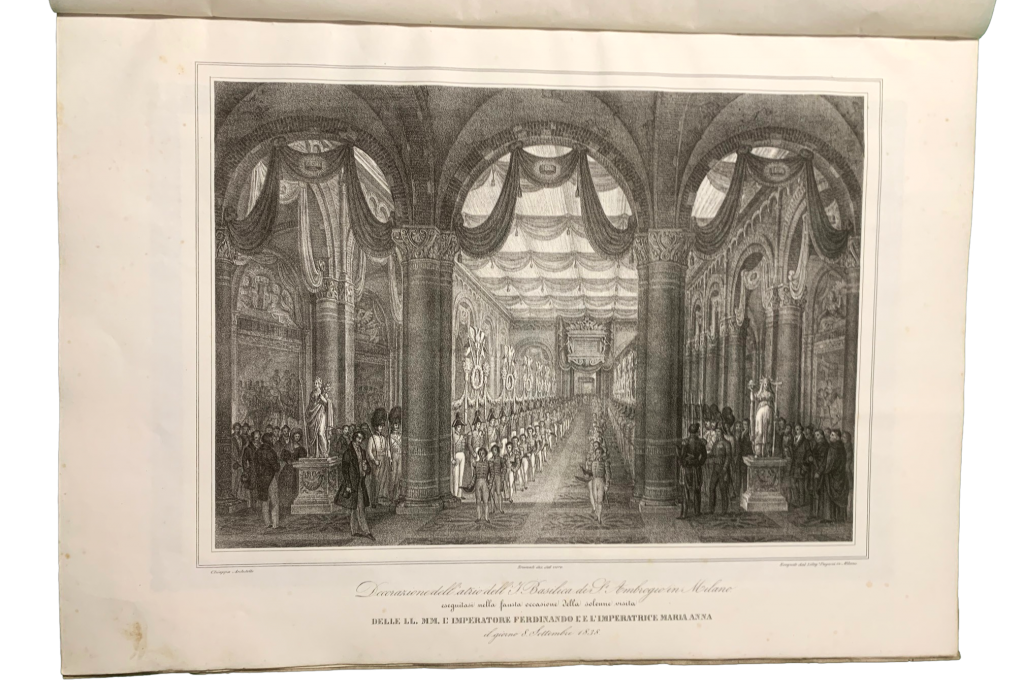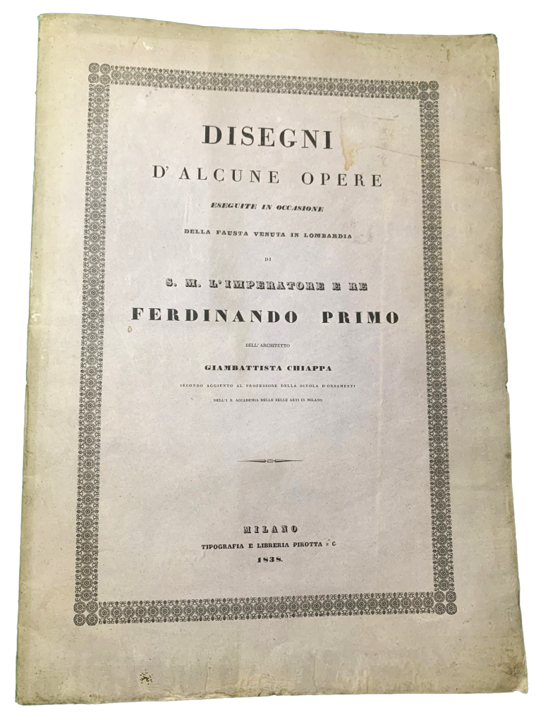 In folio (47x33 cm); (10) pp. e 4 c. di tav. litografiche in bianco e nero con vedute animate di alcuni monumenti milanesi. Ogni tavola è protetta da un'antica velina. Aggiunti all'interno 14 carte così suddivise. Tre rarissimi fogli volanti di due pagine, uno su bella carta gialla, con componimenti commemorativi dedicati a Ferdinando I (Il Perdono di Ferdinando I Ode dedicato alla coltissima e nobilissima Donna Angiola Giorgi di Vistarino da Siro Carati, Nell'Incoronazione di Sua Maestà I. R. A. Ferdinando Primo Inno scritto da Federico Castiglioni, Per la Desideratissima Venuta alla R. Città di Pavia della Sacra maestà di Ferdinando I. Imperatore e Re nostro Graziosissimo Sovrano Omaggio di devozione ed esultanza scritto da Nicolò Barbieri) e pagine con Descrizione dell'Arco Trionfale innalzato fuori di città tratta da opera a stampa. Legatura editoriale in cartoncino molle con titolo entro cornice al piatto anteriore. Opera stampata su carta forte di grande qualità. Tutto il testo è entro cornice. Piatti foderati internamente con carta coeva rosa. Al recto cornice con al centro l'aquila bicipite di Ferdinando I d'Asburgo Lorena, nome completo Ferdinando Carlo Leopoldo Giuseppe Francesco Marcellino d'Asburgo-Lorena (Vienna, 19 aprile 1793 Praga, 29 giugno 1875) che fu imperatore d'Austria e re d'Ungheria dal 2 marzo 1835 al 2 dicembre 1848. Esemplare in magnifiche condizioni di conservazione e nella sua veste originale. Il volume venne realizzato per celebrare la venuta a Milano di Ferdiando I, il 6 settembre del 1838, giorno nel quale venne nominato re del Regno Lombardo Veneto. Al noto architetto milanese Giovan Battista Chiappa (anche Giambattista) vennero commissionati questi monumenti da realizzarsi lungo il tragitto che avrebbe percorso Ferdinando I, proprio per questa occasione. Le grandi tavole rappresentano: la Decorazione dell'atrio dell'I. Basilica di S. Ambrogio in Milano eseguitasi nella Fausta occasione della solenne visita delle LL. MM. L'Imperatore Ferdinando I e l'Imperatrice Maria Anna il giorno 8 Settembre 1838; Arco Trionfale Temporario eseguito all'ingresso della Regia Città di Pavia per festeggiare la fausta venuta dell'Augusto Monarca l'Imperatore e Re Ferdinando I° nel giorno 18 Settembre 1838; Arco temporario di Trionfo rettosi sulla Strada di Circonvallazione della Regia Città di Lodi per festeggiare il fausto ingresso dell'Augusto Monarca l'Imperatore e Re Ferdinando I° nel giorno 21 Settembre 1838; Obelisco di granito rettosi sulla Razza del pubblico passeggio interno della Regia Città di Lodi e dedicato dal Consiglio Comunale nella seduta del giorno 21 Febbraio 1838 a perpetuare la memoria del faustissimo giorno in cui la città fu onorato dalla visita dell'Augusto Monarca l'Imperatore e Re Ferdinando I. Come ci informa lo stesso Chiappa nell'opera, l'obelisco di Lodi venne realizzato in granito per rimanere ad imperitura memoria mentre i due archi trionfali, sotto i quali passò Ferdinando I, furono, invece, realizzati e smantellati nei mesi seguenti all'evento. Chiappa descrive, nell'opera, le ragioni della pubblicazione del volume e riproduce i testi sulle steli, accompagnando il testo con le belle tavole incise a piena pagina da lui disegnate ma incise dal noto incisore, pittore, litografo e disegnatore, originario di Cremona, Giuseppe Bignami. L'opera venne stampata con grande cura ed in un numero limitatissimo di copie. Il nostro esemplare è uno dei meglio conservati in assoluto, con la sua brossura editoriale originale. Rif. Bibl.: Berlin Katalog 3088; ICCU IT\ICCU\MIL\0313434.