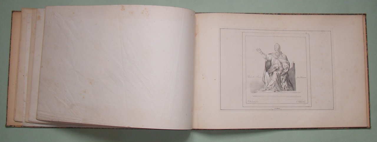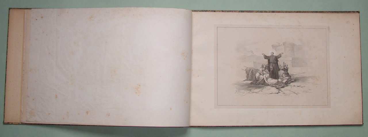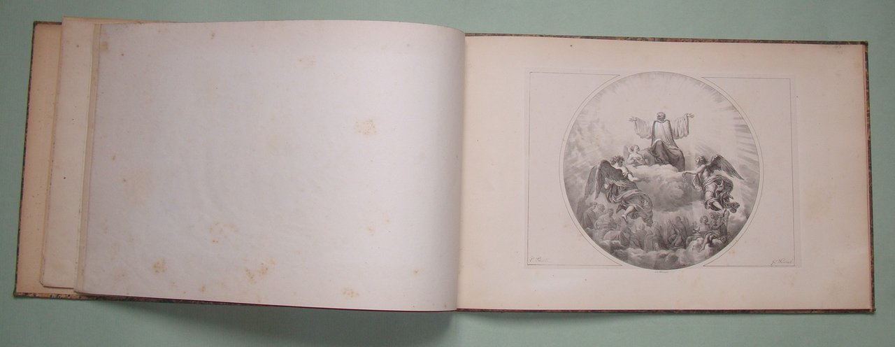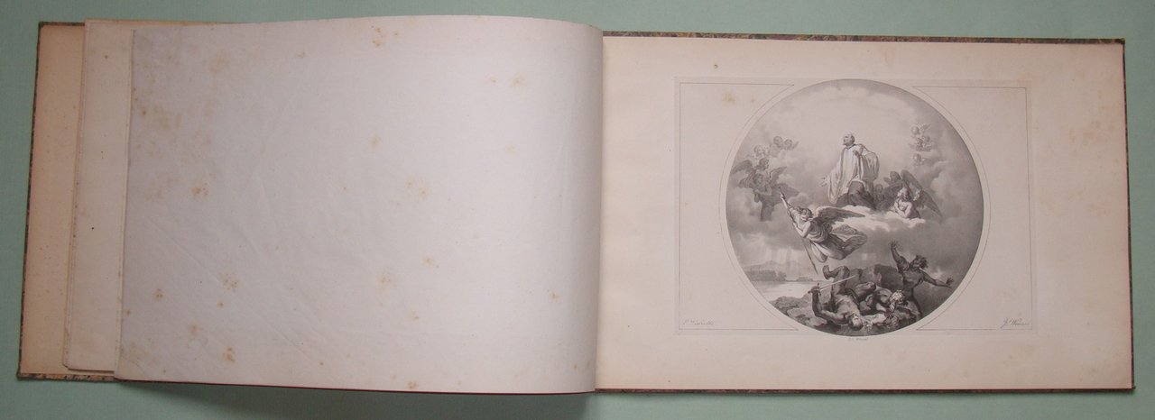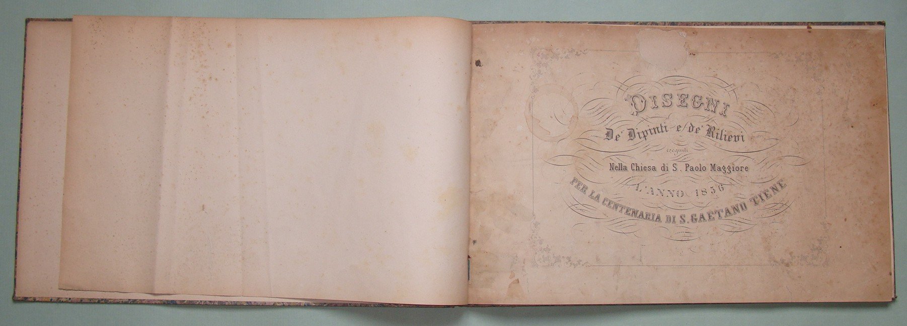DISEGNI DEI DIPINTI e de rilievi eseguiti nella chiesa di S. Paolo in Napoli l'anno 1856 per il centenario di S. Gaetano Thiene. Album in 4to oblungo (cm.29x44). Tredici tavole e la Dichiarazione. Le tavole sono litografie di Wenzel e Paliotti. Cart. coevo, lacerazioni ai piatti.