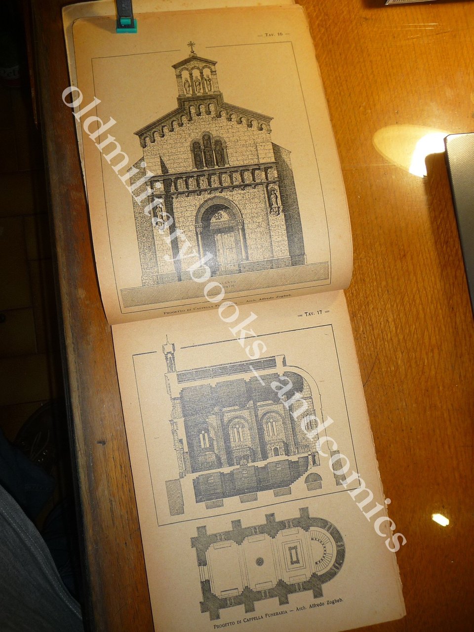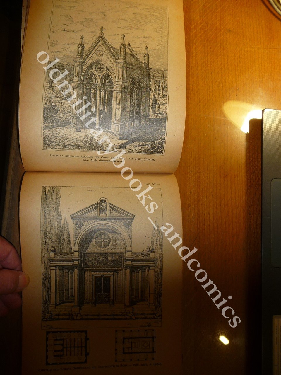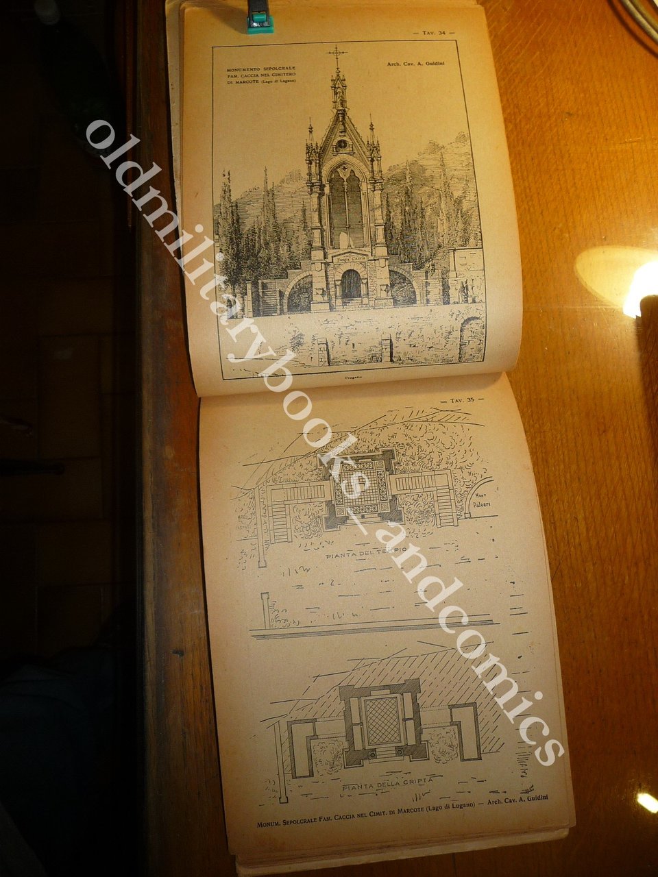 Bella brossura editoriale a piu' colori con titolo in rosso e blu al piatto pagine riproducenti progetti completi con disegni di prospettive, facciate, fianchi, sezioni e piante in scala di lavori eseguiti da importanti architetti nei principali cimiteri d'Italia. Al fondo catalogo di 10 pp. num.pubblicitarie de"l'artista moderno".