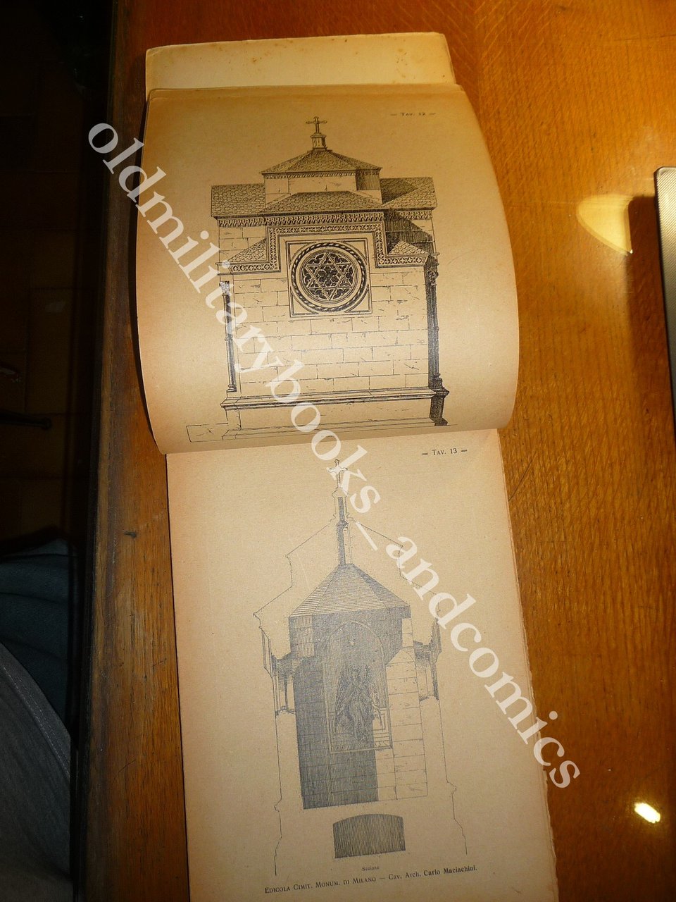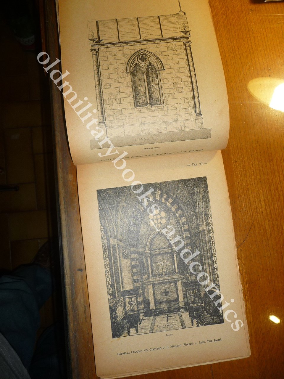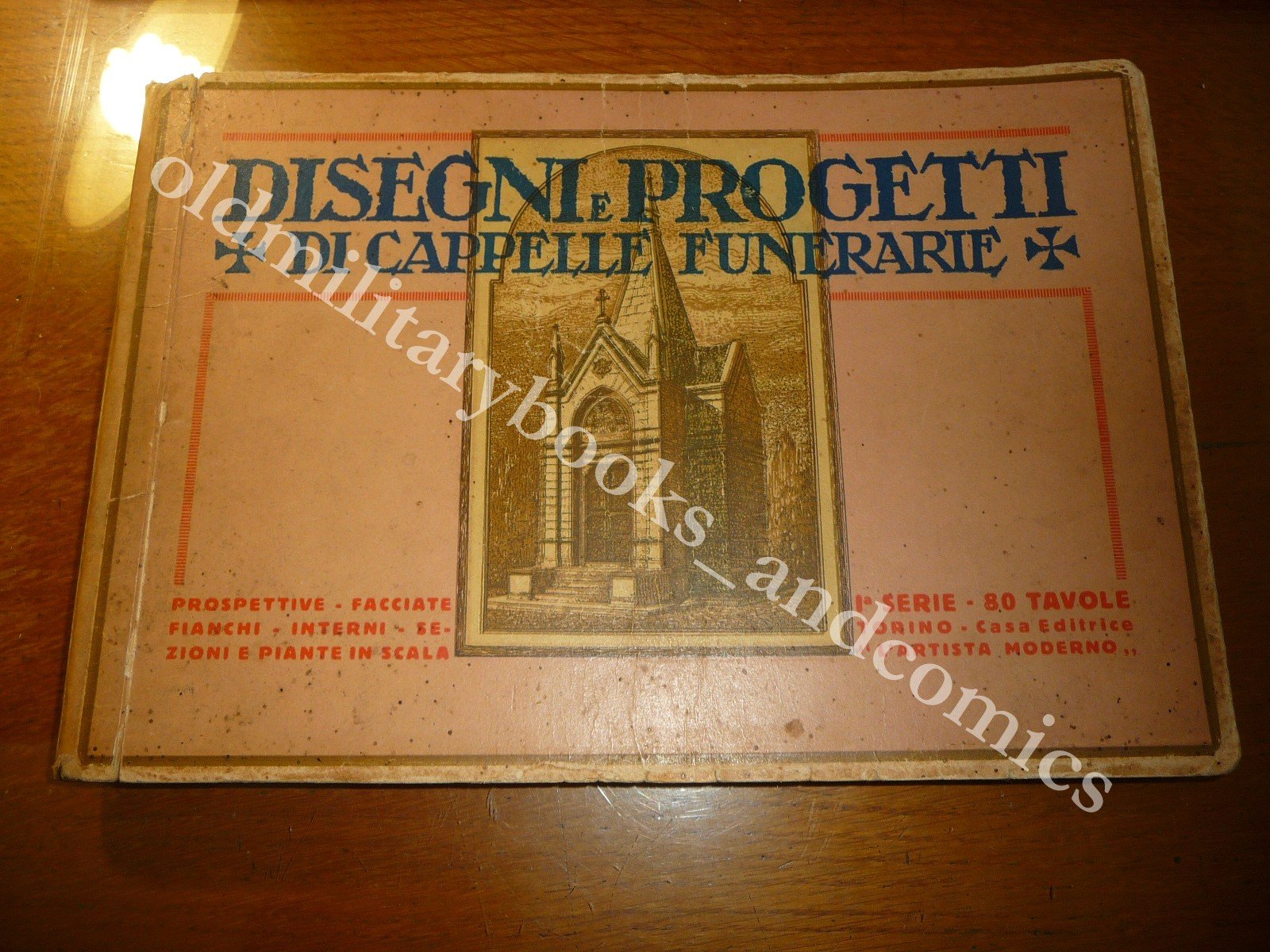 Bella brossura editoriale a piu' colori con titolo in rosso e blu al piatto pagine riproducenti progetti completi con disegni di prospettive, facciate, fianchi, sezioni e piante in scala di lavori eseguiti da importanti architetti nei principali cimiteri d'Italia. Al fondo catalogo di 10 pp. num.pubblicitarie de"l'artista moderno".