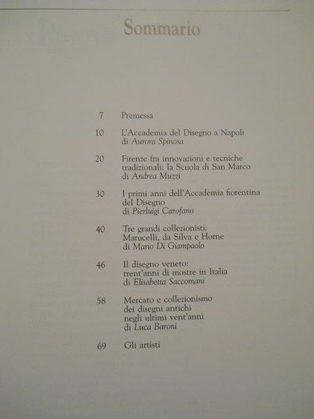 Accademia del disegno a Napoli (A.Spinosa) - Firenze tra innovazione e tecniche tradizionali: la scuola di San Marco (A.Muzzi) - I primi anni dell'Accademia fiorentina del disegno (P.Carofano) - Tre grandi collezionisti . Marucelli , da Silva, Horne (M.Di Giampaolo) - Il disegno veneto :30 anni di mostre in Italia (E.Saccomani) - Mercato e collezionismo dei disegni antichi negli ultimi 20 anni (L.Baroni) - Gli artisti.
