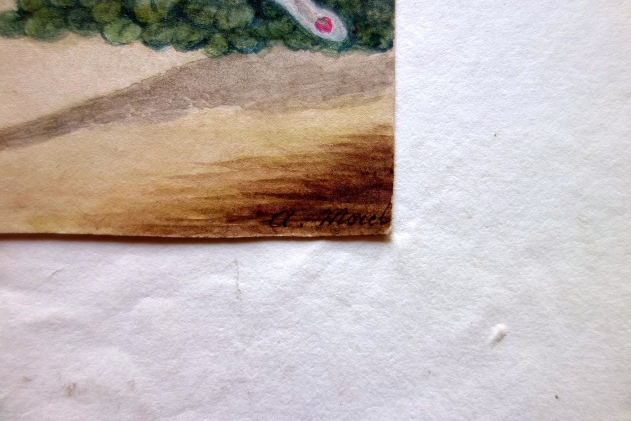Disegno originale, Acquerello originale coppia di danzatori firmato A. Morel(?) metà '800 circa S. d. ma metà '800 circa; acquerello originale su cartoncino applicato a supporto cartaceo; firmato all'angolo inferiore destro (A. Morel?); cm 14x12,5 (acquerello); cm 21,5x29 (supporto). Condizioni di conservazione Acquerello in buone condizioni con trascurabili segni del tempo, leggermente rifilato ai margini. Supporto con piccoli leggeri aloni e tracce di sporco, margine sinistro con piccole tracce di precedente inserimento in volume / raccolta). Acquerello originale di pregevole qualità, con applicazione d'epoca di fissante lucido chiara d'uovo". Firmato. SC03.D17956 N "