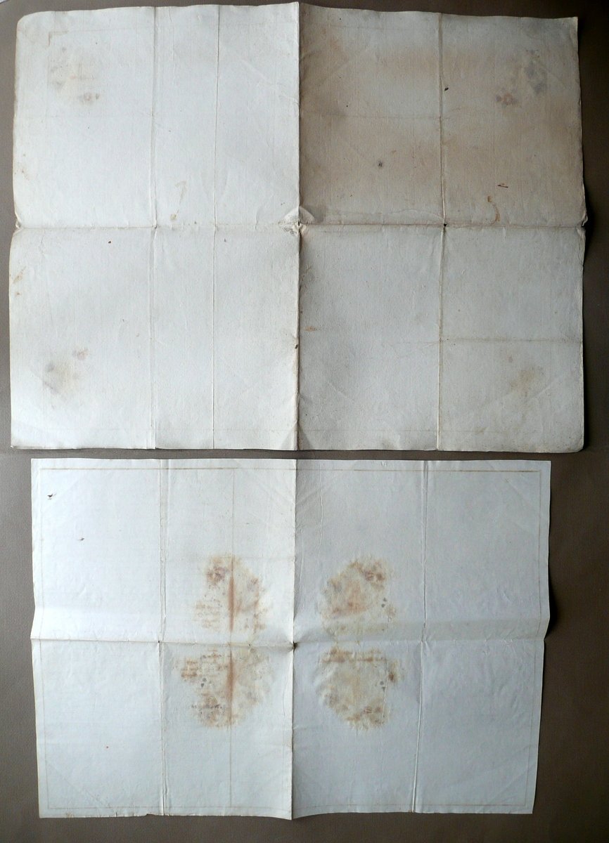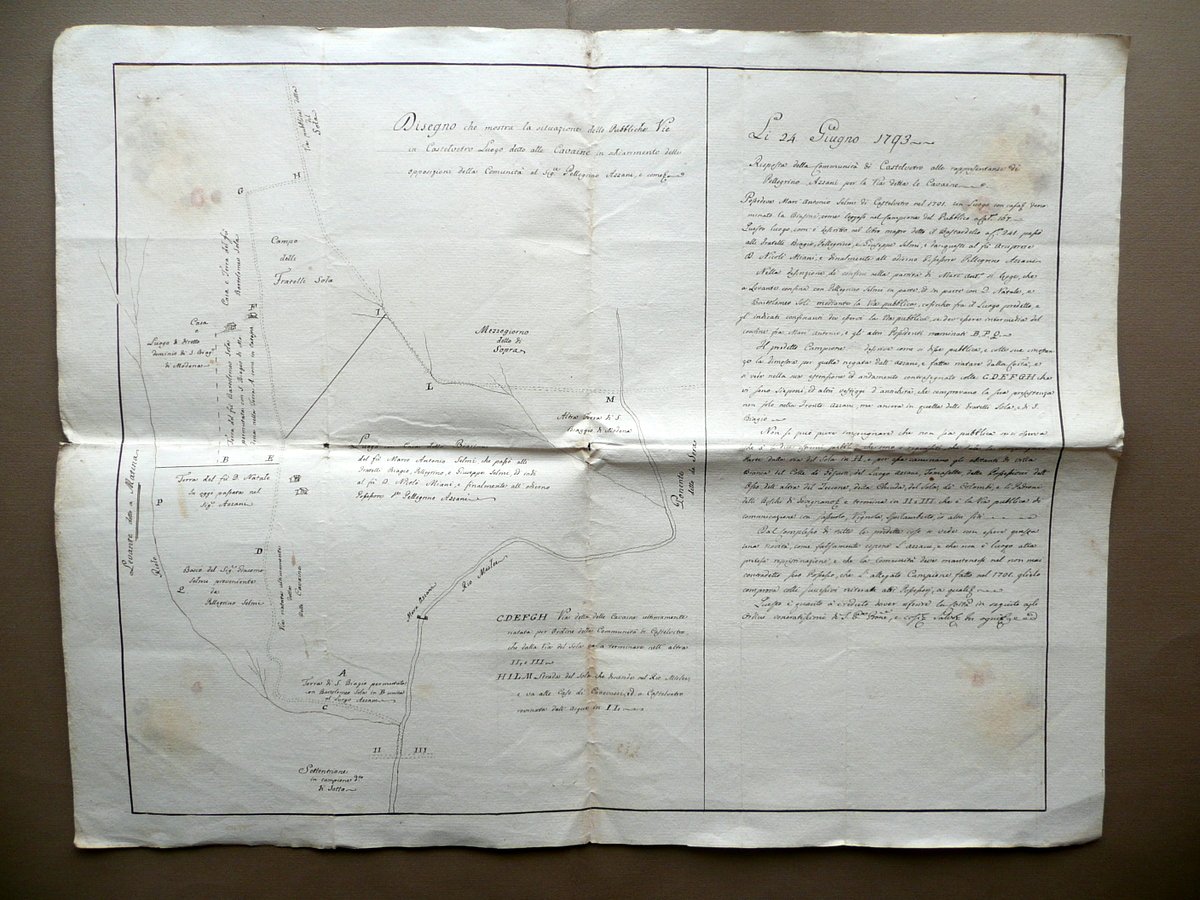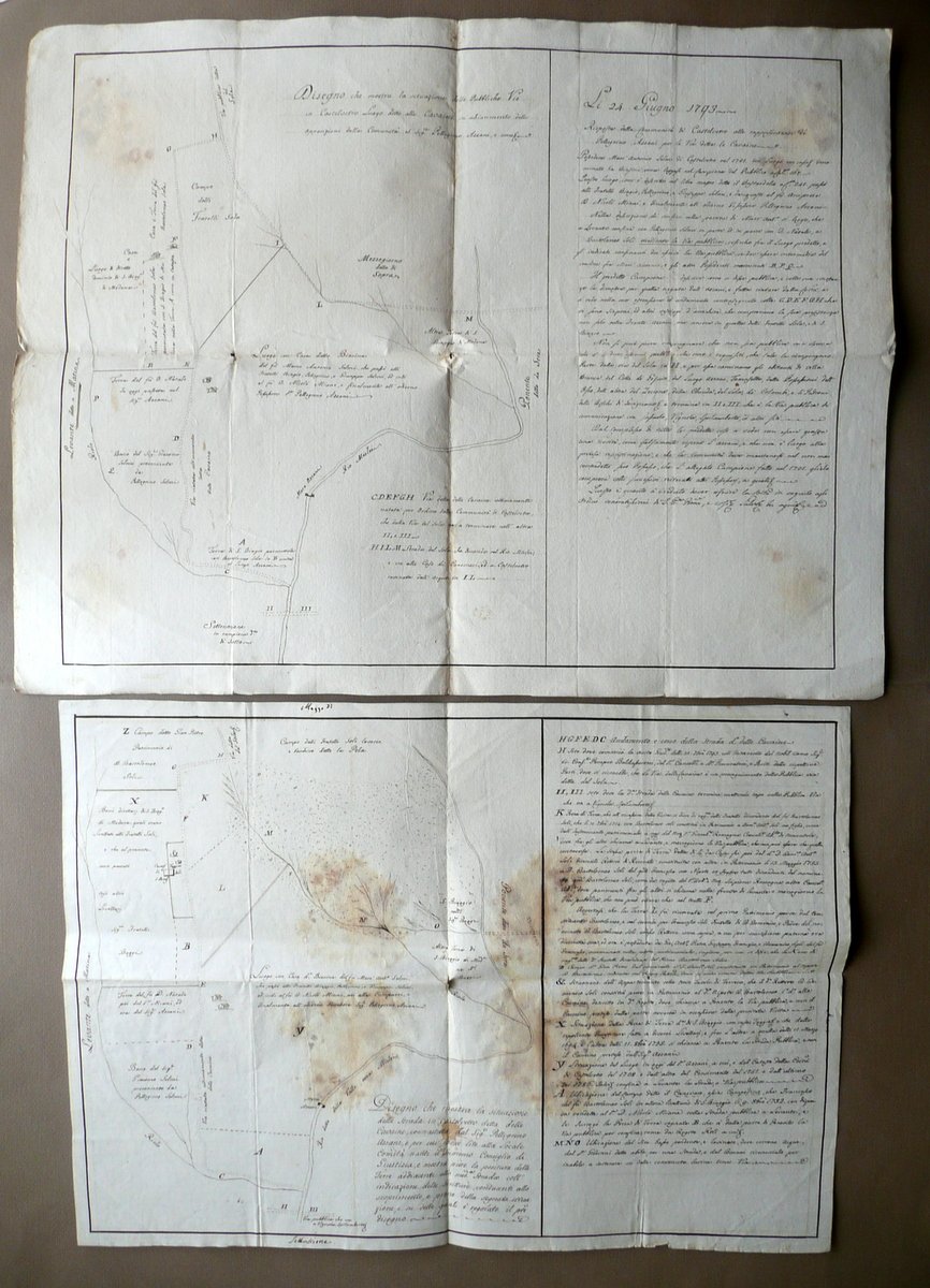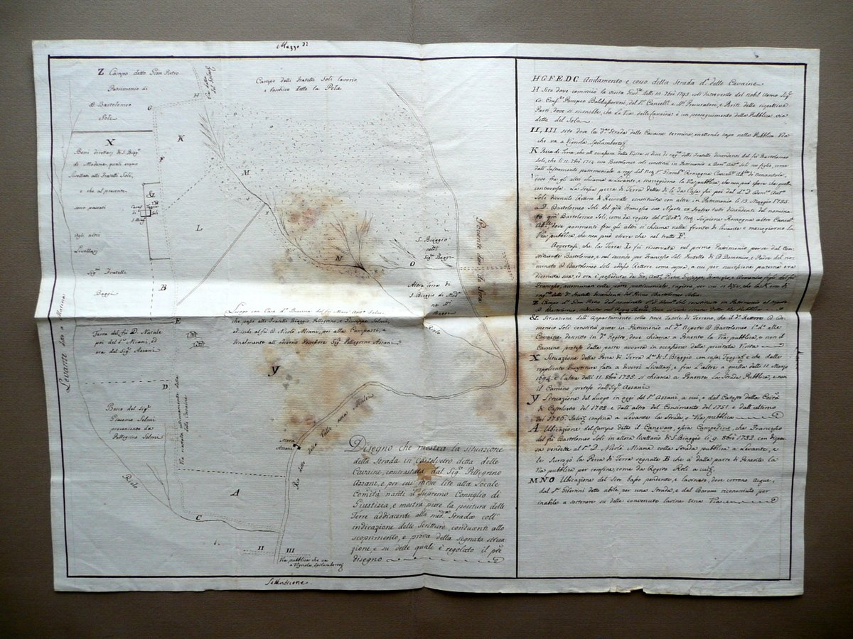 Due disegni, Disegno che mostra la situazione delle Pubbliche Vie in Castelvetro Luogo detto alle Cavaine in schiarimento delle opposizioni della Comunità al Sig.re Pellegrino Azzani" - "Disegno che mostra la situazione della Strada in Castelvetro detta delle Cavaine, contrastata dal Sig. re Pellegrino Azzani, e per cui mosse lite alla Locale Comunità [.] e mostra pure le la positura delle Terre addiacenti alla med. Strada coll'indicazione delle Scritture, conducenti allo scoprimento, e prova della segnata situazione [.]" 1793; due disegni d'epoca relativi ad alcune vie pubbliche in Castelvetro di Modena, entrambi realizzati su grande foglio in carta, corredati da didascalie e note descrittive dei terreni e possedimenti limitrofi a tali strade (vedi foto); lato destro di ciascun foglio con accurata descrizione del rispettivo disegno. Cm 38,5x53,5; cm 46,5x60. Condizioni di conservazion Disegni entrambi complessivamente ben conservati con tracce d'uso; pieghe di conservazione, qualche minima brunitura; alcune leggere tracce di vecchia umidità che non compromettono la lettura del testo o la visione delle illustrazioni (vedi foto). Qualche incrocio delle pieghe con un minimo strappetto. Articolata descrizione per il possesso di beni in Castelvetro (Modena) di ex proprietà Selmi, poi all'Arciprete N. Miani, ed in seguito passate all'Azzani. Coinvolte le località di Villa Bianca, del Colle dei Gesuiti e molte altre località della zona (vedi foto). SC03.D12039 N "