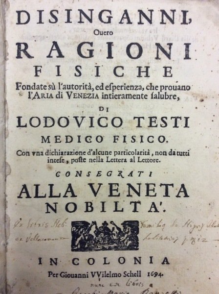 DISINGANNI, OVERO RAGIONI FISICHE FONDATE SU' L'AUTORITA', ED ESPERIENZA, CHE PROVANO L'ARIA DI VENEZIA INTIERAMENTE SALUBRE. - Con una dichiarazione d'alcune particolarità, non da tutti intese, poste nella lettera al lettore.