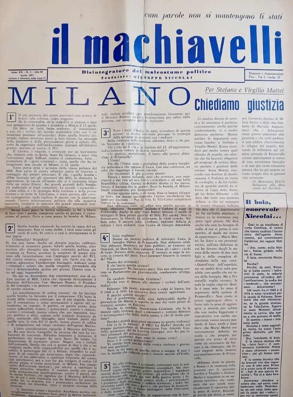 Formato giornale cm. 55x35. Articolo in prima pagina sulla 'Strategia della tensione'.
