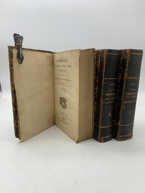 3 volumi in 8, pp. (4) + 508; 496; 606. Marca tipografica ai frontespizi. Mezza pelle ottocentesca solida con segni d'uso alle cerniere. Edizione originale di questo importante dizionario, opera del lessicografo chierese Casimiro Zalli. Nel 1830 verrà ristampato in due volumi dallo stesso Barbiè. Nella prefazione l'autore sottolinea come < il dialetto piemontese è poco stimato dai forestieri e trascurato dai nazionali. Per altro è così ricco ed abbondante di vocaboli da poter esprimere tutti i nostri sentimenti con facilità, naturalezza, forza e grazia >. Nel terzo volume è presente una corposa aggiunta (361 pagine), che lo Zalli afferma di aver inserito ricavandoli dal Dizionario di Luigi Capello (che era stato pubblicato l'anno precedente). Questa appendice risulta particolarmente interessante, presentando molti modi di dire e affermazioni gergali. Sempre nel terzo volume sono presenti diversi sonetti, sempre in piemontese, all'indirizzo dell'autore. Clivio, 3124. Collino, Storia della poesia dialettale, pp. 17 – 18. Prati, Vocabolario delle parlate, 692.