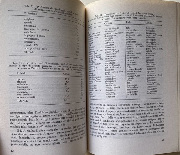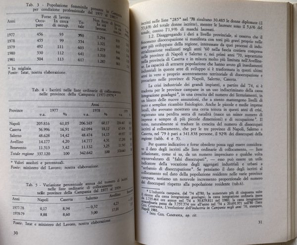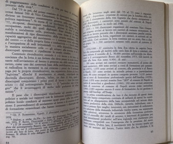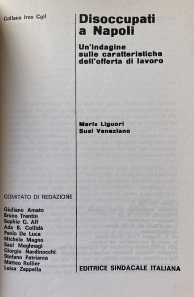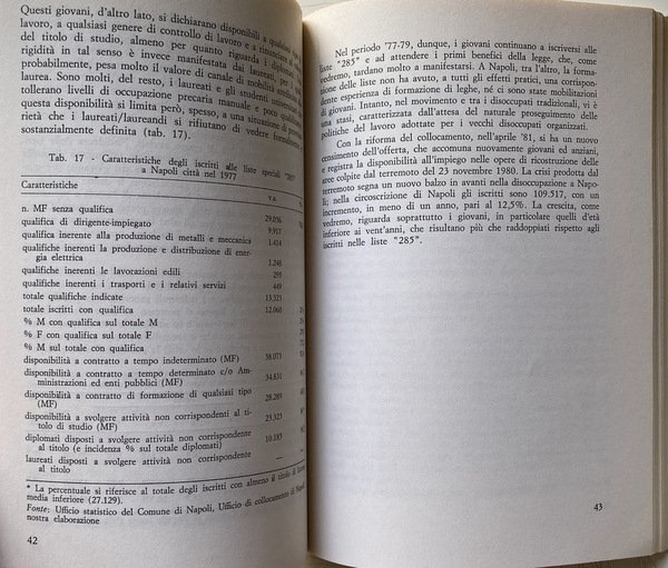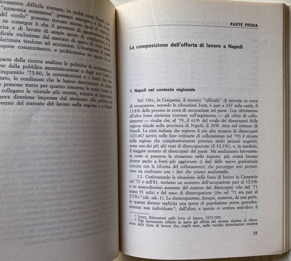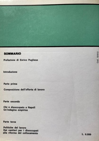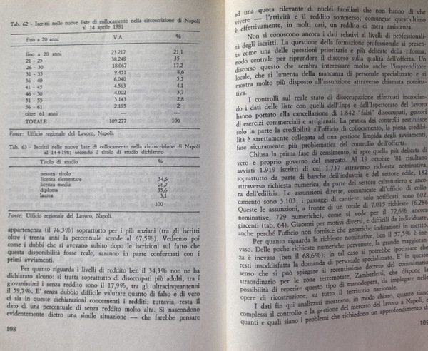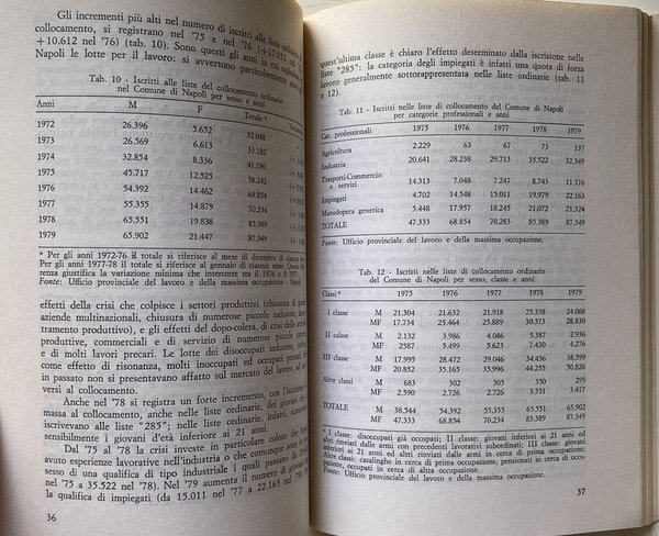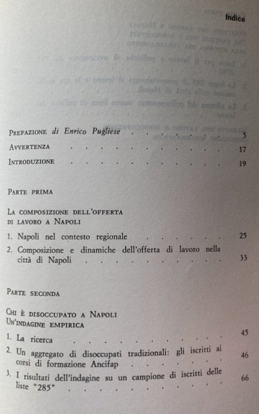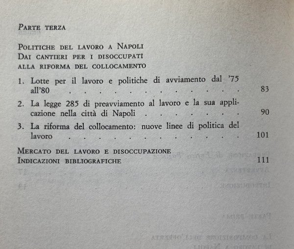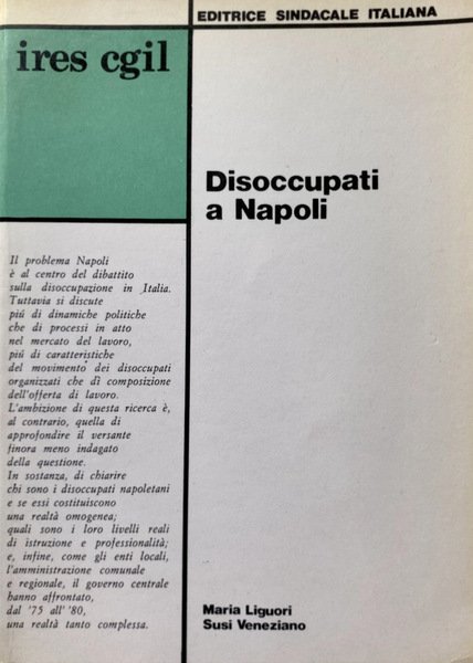 Soggetti: Napoli, Disoccupazione, Lavoro precario, Lavoro nero, Italia meridionale, Mezzogiorno, Economia sommersa, Istituzioni, Mercato del lavoro irregolare, Sindacati, Meridionalismo, Inchieste, Dossier, Ricerca, Indagini, Sociologia, Precariato, Occupazione, Disoccupazione giovanile, Giovani, Scuola dell'obbligo, Abbandono scolastico, Salario, Scioperi, Diritti sociali, Lotte, Comunismo, Sindacalismo, Proletariato, Imprenditoria, Donne, Professioni, Mestieri, Formazione professionale, Assunzioni, Orario, Busta Paga, Anni Settanta, Anni Ottanta, Fabbriche, Operai, produzione, Specializzazione, Malavita, Camorra, Appalti, Istruzione, Analfabetismo, Movimenti politici, Politica, Partito comunista, PCI, Cultura di fabbrica, Socialismo, Movimento operaio italiano, Disoccupati organizzati, Stato, Regione, Comune, Lotta di classe, Marxismo, Documenti, Dati, Percentuali, Sussidio, Assistenzialismo, Artigianato, Manodopera, Quartieri popolari, Imprenditorialità giovanile, Città, Classe operaia, Collocamento, Comitati, Compagni, Manifestazioni, Reddito, Cittadinanza, Poveri, Povertà, Sussistenza, Welfare, Sindacato, Sistema, Vico Cinquesanti, Stella, Vicaria, Poggioreale, Detenuti, Cortei, Concertazione, Posto fisso, Potere, Mentalità, Famiglia, Novecento, Economia del vicolo, Caserta, Avellino, Benevento, Salerno, Terra di Lavoro, Dirigenti, Impiegati, Enti pubblici, Titolo di studio, Scolarizzazione, Trend, Offerta, Laureati, Diplomati, Liste, Iscritti, Studenti, Post-laurea, Qualifica, Trasporti, Servizi, Turismo, Edile, Lavori utili, Netturbini, Ancifap, Ilva, Italsider, Atan, Ferrovie, Poste, Commercio, Ambulanti, In proprio, Autonomi, Cantieri, Fabrizia Ramondino, Legge 285, Riforma, Preavviamento, Anni Ottanta, Bibliografia, Giuliano Amato, Bruno Trentin, Siniscalchi, Colasanti, Bruno, Moscati, Pugliese, De Marco, Dini, Massa, Accornero, Frey, Paci, Libri rari, libri Vintage Fuori catalogo, Naples, Unemployment, Precarious work, Black work, Southern Italy, Underground economy, Institutions, Irregular labor market, Unions, Southernism, Investigations, Research, Investigations, Sociology, Precariat, Employment, Youth unemployment, Young people, Compulsory school, Abandonment Wages, Strikes, Social rights, Struggles, Communism, Trade unionism, Proletariat, Entrepreneurship, Women, Professions, Professions, Vocational training, Recruitments, Hours, Paycheck, Seventies, Eighties, Factories, Workers, Production, Specialization, Underworld, Procurement, Education, Illiteracy, Political movements, Politics, Communist party, Factory culture, Socialism, Italian labor movement, Organized unemployed, State, Municipality, Class struggle, Documents, Data, Percentages, Subsidy, Welfare, Crafts, Manpower, Popular neighborhoods, Youth entrepreneurship, Cities, Working class, Employment, Committees, Comrades, Events, Income, Poverty, Subsistence, Syndicate, System, Inmates, Parades, Concertation, Fixed place, Power, Mentality, Family, Twentieth century, Economy of the alley, Executives, Employees, Public bodies, Qualification, Schooling, Offer, Graduates, Graduates, Lists, Enrolled, Students, Post-graduate, Qualification, Transport, Services, Tourism, Construction, Useful works, Garbage collectors, Railways, Post offices, Commerce, Peddlers, Self-employed, Autonomous, Construction sites, Law, Reform, Pre-start-up, Eighties, Bibliography, Rare books, Out of print books