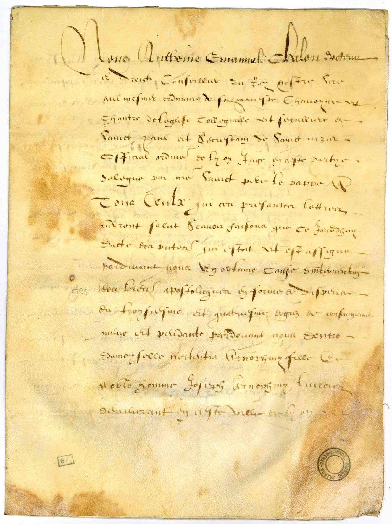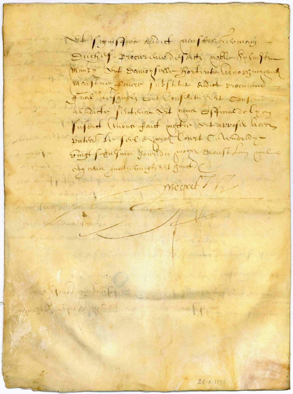 Documento su pergamena (mm. 318x235) in francese, elaborato e scritto a Lione nel 1588. Composto di due bifogli (quindi di 4 carte) di una bellissima pergamena che conserva tutta la sua freschezza. Alla prima carta timbri della raccolta Giorgio Franco di Firenze. Scrittura semihybrida formata (Bastarda).