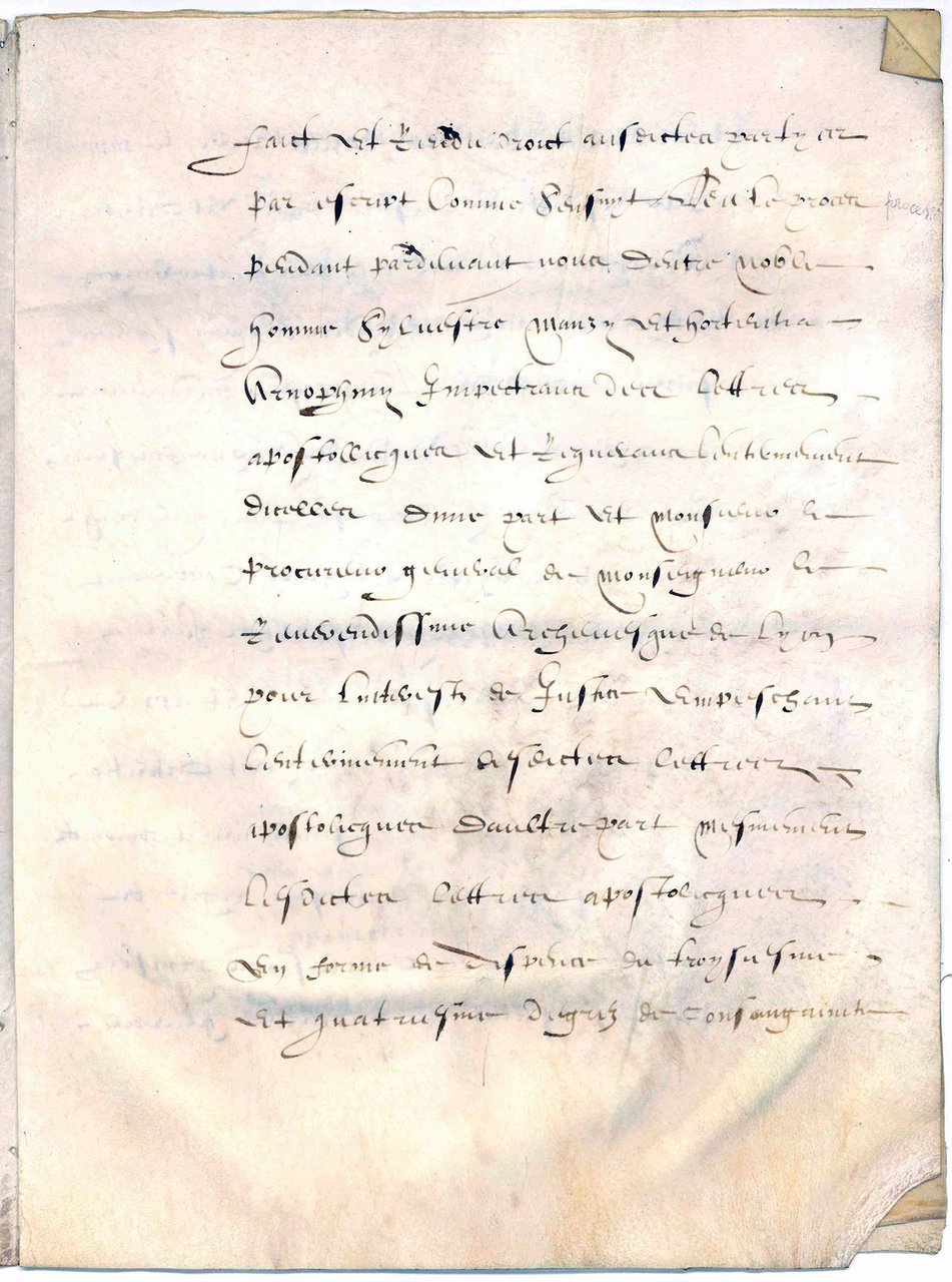 Una giovane e un giovane italiani, nobili di Lucca, ma domiciliati a Lione, vogliono sposarsi, ma vi si frappone un certo qual grado di consanguineità che per l'epoca poteva essere ostativo alle nozze (terzo e quarto grado). Lei Ortensia Arnolfini di Giuseppe e lui Silvestro Manzi si rivolgono al Papa che invia, secondo la prassi, delle Lettere Apostoliche in forma di dispensa, che insieme ad altre testimonianze e a un interrogatorio (enqueste) dei due attori, contribuiranno a dar vita al processo. Le più alte autorità lionesi sono coinvolte nella causa. Anthoine Emanuel Chalon, docteur ès droit, Consigliere de Re, suo Elemosiniere, Canonico delegato del Papa, e Giudice presiede la causa e firma l'atto a pagina 7 in basso. Avvocato (procureur) dei due giovani è Germain Duchef, mentre il procuratore generale dell'Arcivescovo si chiama Faure. La sentenza (sentence) è favorevole ai due giovani e questo viene espresso a p. 7 con la formula: "declaire et declairons le mariage se pouvoir faire et contracter...dispense et dispensons desdiets degres de consanguineite...". Più sotto leggiamo a modo di importante corollario che i bambini nascituri saranno del tutto legittimi, ciò che è carico di conseguenze per la futura trasmissione del patrimonio. «Ce vendredi vingt sixiesme jour du mois daouste lan milcinq cens quatrevingts et huict». (signè:) Megref.