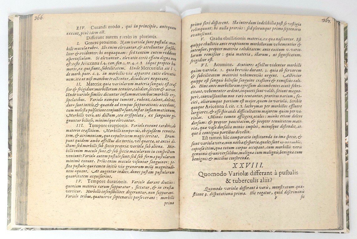 >6 parti in un vol. in-8 (195x145 mm), ff. non num. 14; 18; 22; 22; 12; 26; ciascun libello con frontespizio proprio. Legatura moderna in m. marocchino, titolo in oro al dorso. Prima edizione di queste 6 dispute su morbillo e vaiolo (e varicella), tenute all'Università di Strasburgo, alla cui discussione parteciparono B. Nagelius, J. Becker, J.J. Wepfer, B. Scheffer, M. Ramelovius e P. Barbette. Melchior Sebisch (Strasbourg 1578-1674) fu primo professore di medicina ed archiatra ordinario nell'Università di Stasburgo per ben 62 anni; assai stimato, ebbe molti incarichi ed onori e dall'imperatore Ferdinando II fu creato conte palatino nel 1630; eruditissmo in ogni settore della medicina, scrisse vari trattati ed un gran numero di dissertazioni accademiche. La distinzione tra vaiolo e varicella, nel XVII°, secolo non era stata ancora compresa e venivano considerate variante della stessa malattia. Bell'esemplare. Manca a tutti i repertori consultati. Leclerc, Biogr. mèdicale I, 434-5.