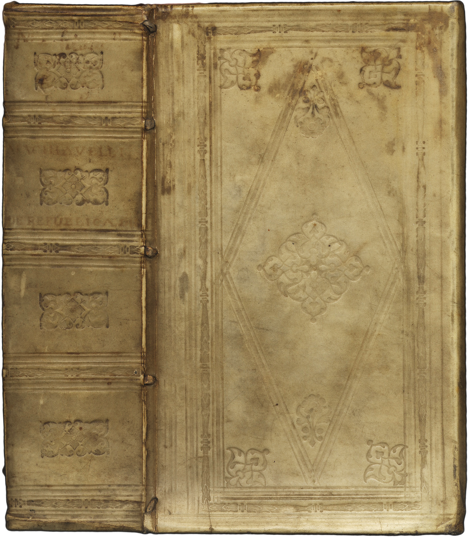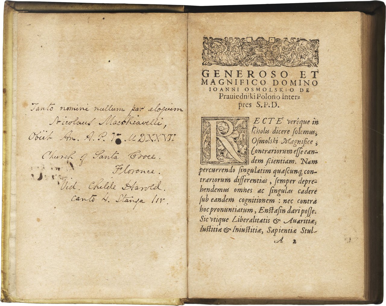 >in-8, pp. (8), 631, (17, ultimo f. bianco), bellissima leg. coeva in p. pergamena con unghie, decorazione geometriche e floreali ai piatti e al dorso, impresse a secco. Testatine ed iniziali istoriate nel testo. Seconda edizione (8 anni dopo la prima dello stesso tipografo) della traduzione latina del "Discorso sopra la prima decade di Tito Livio", a cura, come si desume dalle iniziali poste alla fine della prefazione, di Iohannes Nicolaus Stupanus (1542 - 1621). L'opera, nella quale Machiavelli, prendendo spunto da Tito Livio, espone il suo originale pensiero sul modo di conservare gli Stati ed i Principati, apparve per la prima volta nel 1531. La traduzione latina, pubblicata con un titolo completamente distorto, che non menziona neppure Tito Livio, ed in un piccolo paese sul confine franco-tedesco, è dovuta al fatto che Main-8, pp. (8), 631, (17, ultimo f. bianco), bellissima leg. coeva in p. pergamena con unghie, decorazione geometriche e floreali ai piatti e al dorso, impresse a secco. Testatine ed iniziali istoriate nel testo. Seconda edizione (8 anni dopo la prima dello stesso tipografo) della traduzione latina del "Discorso sopra la prima decade di Tito Livio", a cura, come si desume dalle iniziali poste alla fine della prefazione, di Iohannes Nicolaus Stupanus (1542 - 1621). L'opera, nella quale Machiavelli, prendendo spunto da Tito Livio, espone il suo originale pensiero sul modo di conservare gli Stati ed i Principati, apparve per la prima volta nel 1531. La traduzione latina, pubblicata con un titolo completamente distorto, che non menziona neppure Tito Livio, ed in un piccolo paese sul confine franco-tedesco, è dovuta al fatto che Machiavelli fosse all'Indice sin dal 1559 e dunque le sue opere politiche dovessero circolare senza attirare l'attenzione. L'editore Foillet introdusse l'arte della stampa nel 1586 a Montbéliard e costituì uno dei più importanti centri tipografici della cultura protestante. Il libro è quindi di notevole importanza per la bibliografia machiavelliana, e di estrema rarità sul mercato. Ottimo esemplare (uniforme lieve arrossatura della carta, due antiche firme di possesso al titolo). Bertelli Innocenti 197 (l'esemplare descritto infatti reca sul titolo "ne legatur sine permissione"). Adams M-23. Brunet, Géographie, col. 874: "cette ville fut, lors des guerres de la reforme, un des plus vastes atéliers de la typographie protestante... ils étaient imprimés par un typographe qui depuis acquit une juste célébrité: ç'était Jacques Foillet... Parmi les plus curieuz imprimés... plusieures traductions latines des traités de Machiavel". Machiavelli fosse all'Indice sin dal 1559 e dunque le sue opere politiche dovessero circolare senza attirare l'attenzione. L'editore Foillet introdusse l'arte della stampa nel 1586 a Montbéliard e costituì uno dei più importanti centri tipografici della cultura protestante. Il libro è quindi di notevole importanza per la bibliografia machiavelliana, e di estrema rarità sul mercato. Ottimo esemplare (uniforme lieve arrossatura della carta, due antiche firme di possesso al titolo). Bertelli Innocenti 197 (l'esemplare descritto infatti reca sul titolo "ne legatur sine permissione"). Adams M-23. Brunet, Géographie, col. 874: "cette ville fut, lors des guerres de la reforme, un des plus vastes atéliers de la typographie protestante... ils étaient imprimés par un typographe qui depuis acquit une juste célébrité: ç'était Jacques Foillet... Parmi les plus curieuz imprimés... plusieures traductions latines des traités de Machiavel"Graesse IV, p. 326.