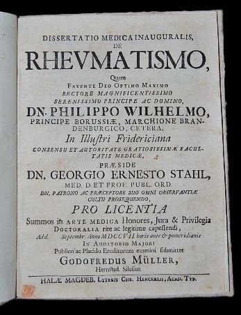 Dissertatio Medica inauguralis. De Rheumatismo, quam Favente Deo Optimo Maximo Rectore Magnificentissimo Serenissimo Principe ac Domino Dn. Philippo Wilhelmo Principe Borussiae, Marchione Brandenburgico, Cetera, In Illustri Fridericiana Præside dn.