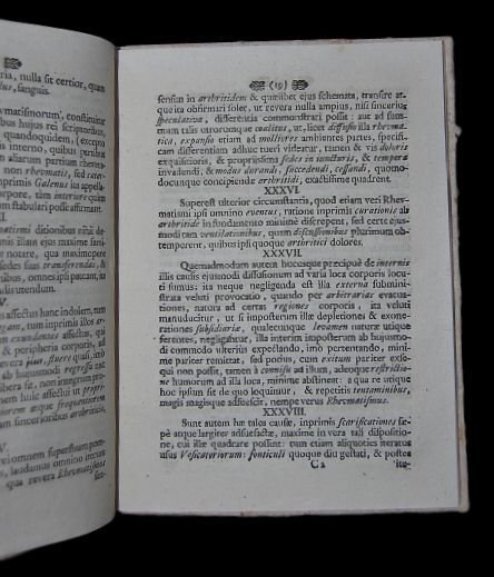 In 4° piccolo (18,7×14,2 cm); 54, (2 b.) pp. Legatura settecentesca in tutto carttoncino molle. Molto raro, un solo esemplare censito in ICCU. Prima edizione di questo interessante studio legato ai reumatismi del noto medico tedesco Godofredus Muller. Testatine e iniziali xilografiche. Ottimo stato di conservazione.