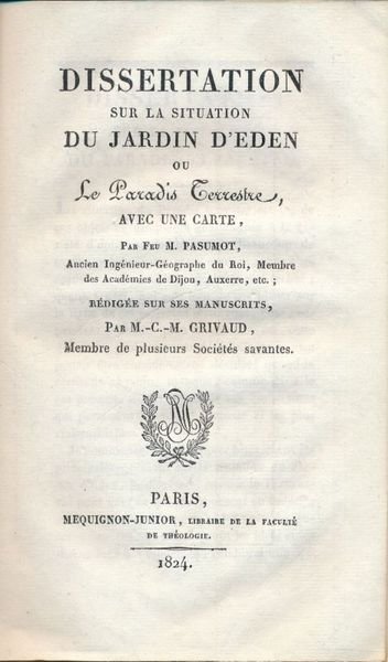 Mequignon junior 1824 Paris, Mequignon junior, 1824. Plaquette In-8 brochée sous couverture d'attente de 24 pages. Bien complet de la carte dépliante "Carte du jardin d'Eden ou Paradis Terrestre". Ouvrage posthume rédigé sur les manuscrits de feu François PASUMOT, Ancien Ingénieur Géographe du Roi, Membre des Académies de Dijon, Auxerre etc. par M. C. M. GRIVAUD, Membre de plusieurs Sociétés Savantes. Francois PASUMOT né et décédé à BEAUNE (1733 - 1804), s'appuyant sur les textes sacrés tente une localisation précise du Paradis Terrestre. Peu courant.