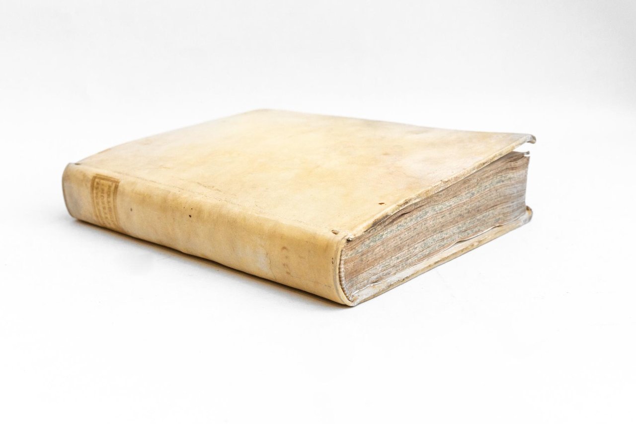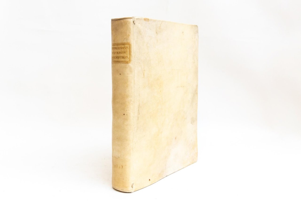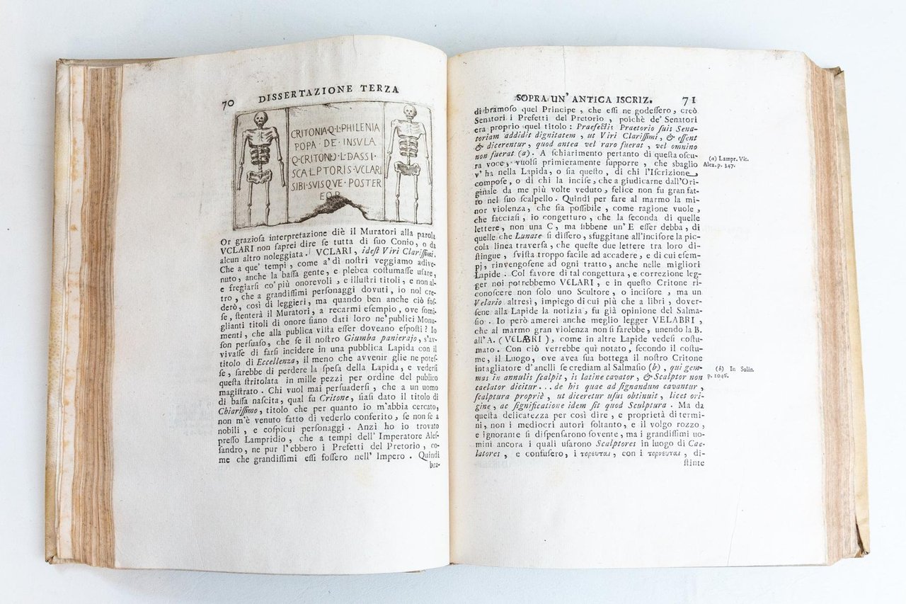4°, mm 200x265, pp. XII, 428, 8 tavole di cui 6 ripiegate e numerose incisioni nel testo. Ritratto calcografico del dedicatario, Giulio Cesare Barberini Colonna, sottoscritto "Greg. Giusti del. Ant. Zaballi scul" e dedica calcografica, con lo stemma Barberini-Colonna, sottoscritta "M. Carloni inv. e incise". Legatura coeva in piena pergamena rigida con titolo su tassello al dorso. Foro alla prima carta bianca per rimozione di ex-libris e abrasione al contro-piatto per la medesima ragione, probabilmente era l'ex-libri del cardinale Mario Compagnoni Marefoschi. Bella copia, normali arrossature lievi e marginali. Opera erudita di grande interesse, contenente oltre a otto dissertazioni sulle antiche iscrizioni, l'interessante trattato “De veteri quodam solari horologio nuper invento epistola”, di François Jacquier, alle pagine finali 383-394, con due tavole ripiegate. Provenienza: le ragioni per cui possiamo ipotizzare che l'ex libris rimosso fosse quello del cardinale Mario Compagnoni Marefoschi sono due: la legatura è molto simile al volume di Ridolfino Venuti, proveniente da quella collezione. Nel catalogo della vendita della collezione Marefoschi compare il volume di Oderico al n. 2637, stimato lire 180 (seppur recante la data 1764 è sicuramente un errore di stampa poiché non esiste edizione in quell'anno). . *** TUTTI I NOSTRI LIBRI SONO VISIBILI PREVIO CONTATTO MAIL O TELEFONO NELLA NUOVA SEDE DI MILANO: LIBRERIA COSMOPOLIS, VIA JOMMELLI, 22. ***