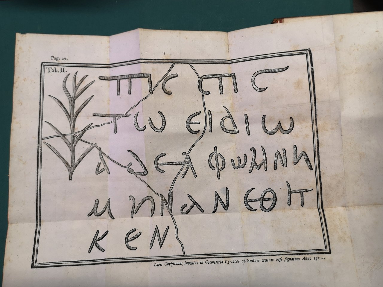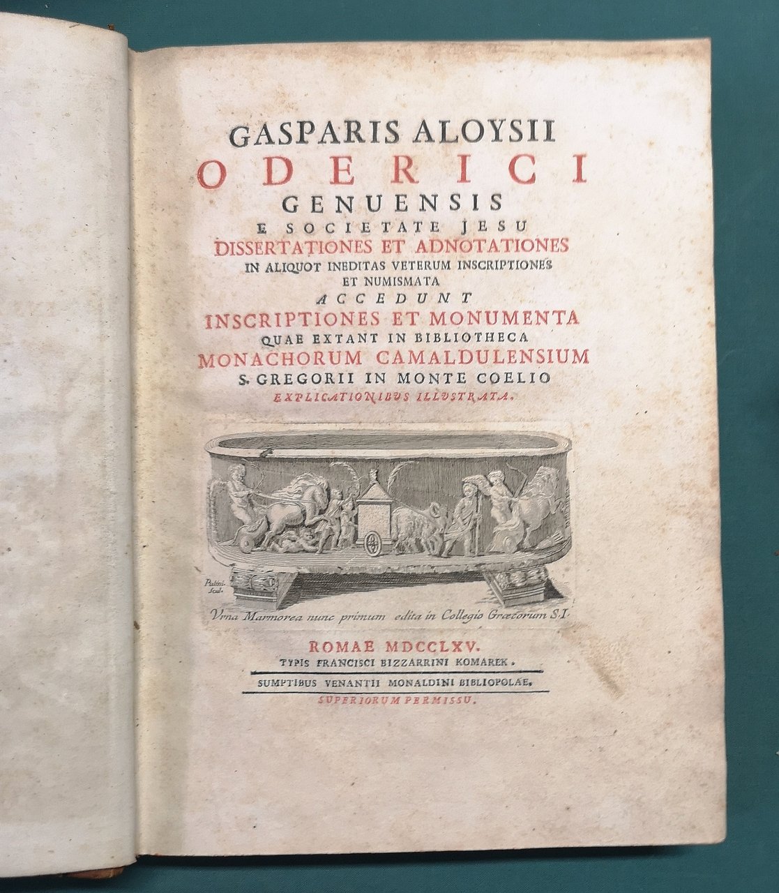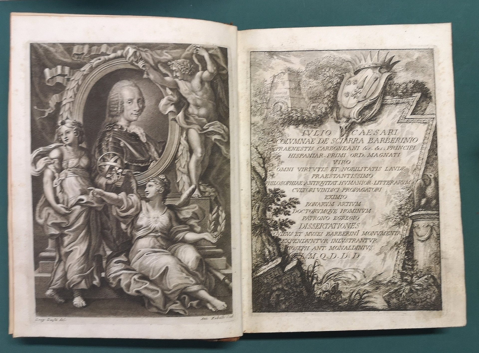 >in-4, pp. XII, 428, legatura ottocentesca in m. pelle ed angoli, piatti in cartone rustico, titolo ms. al dorso, tagli rossi. Titolo a stampa rossa e nera con vignetta inc. da Pulini; testatine, finaletti ed iniz. silogr. E' corredato di elaborato antiporta figurato inc. da Carloni con dedica del Monaldini al nobile Giulio Cesare Colonna Sciarra Barberini, il quale è anche raffigurato nel magnifico ritr. con fig. allegoriche inc. da Ant. Zaballi da Greg. Giusti, 8 tavole f.t., alcune delle quali ripieg., ed incisioni in rame ed in legno n.t. Dotte dissertazioni in latino ed in italiano su varie antichità romane: ''De Trallianorum numo; De annonymi martyris Epitaphio; Sopra un'antica iscrizione del Palazzo Barberini; Sopra un'antica iscrizione del Museo Kircheriano; Sopra una moneta di Volterra; De veteri quodam Solari Horologio nuper invento Epistola'', etc. L'autore fu dotto gesuita (Genova 1725-1803). Buon esempl. marginoso (con ingialliture della carta). Manca a Cicognara. Olschki, Choix XI 17687. Rossetti 7544. Platneriana 299. De Backer-Sommervogel V, col. 1868, n. 4.