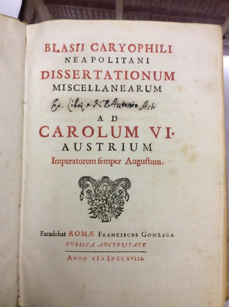 In-8 (mm. 245x173), p. pergamena coeva, titolo oro su tassello al dorso, pp. (4),XVI,360,(2), tit. in rosso e nero al frontespizio, ornato da alcuni grandi e bei capilettera figurati e finali, inc. su legno, con 1 tavola fuori testo "Edizione originale". Biagio Garofalo, importante filologo e archeologo napoletano (1677-1762) fu autore di numerose opere. Queste Dissertationes miscellaneae, Roma, 1718, sont au nombre de six; la première, qui est la plus importante, traite du commerce des anciens: ce recueil devait avoir une suite, qui ne parut point, così Biographie Universelle, XVI, p. 492. La seconda interessante dissertazione (da p. 185 a 305) De.. sive hyssopo è dedicata all'origano, pianta aromatica nota a tutti per i suoi utilizzi in cucina; non meno notevoli sono le proprietà che lo rendono apprezzato nell'ambito della medicina naturale.L'ultima riguarda il ritratto di Asclepiade di Bitinia, famoso medico greco, qui rappresentato in una bella tavola (ripieg.) inc. in rame da Vincenzo Franceschini.Firma di apparten. al frontesp., con qualche lieve fiorit. o arross. ma complessivam. buon esemplare.