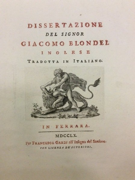 In-8 gr. (mm. 276x200), cartonato rustico coevo (dorso restaur.), pp. (4), 212, frontespizio con tit. in rosso e nero e bella vignetta inc. in rame dallo Zucchi (Ercole e il leone); ornato da una belliss. testata, tre capilett. figur. a vignetta e un finale, finemente inc. in rame. Uniti: un Supplemento (con una lunga serie di esempi di parti più o meno mostruosi causati dall'immaginazione della madre in gravidanza) + un Ragionamento del Dottore Ignazio Vari al Dottor Lucio Bonaccioli (su quesiti posti dal Blondel).<br>"Prima edizione italiana" di questa curiosa dissertazione, a cura dell'Ab. Antonio Meloni.<br> Cfr. Blake, p. 51 - Biographie Médicale,II, p. 290: Jacques-Auguste Blondel (1666-1734), anglais de naissance, mais français d'origine, fut agrégé au Collège des médecins de Londres.. Il publia ce livre (The strength of the imagination of pregnant women examined... London, 1727) sans y mettre son nom. Il y démontre que l'imagination de la mère ne peut exercer aucune influence sur l'enfant, puisque celui-ci jouit de la vie en propre, et qu'il ne tient à elle que par des vaisseaux très déliés par rapport aux deux corps.<br>Con una lunga dedica autografa dell'Ab. Antonio Meloni, datata Ferrara, 6 marzo 1760. Bell'esemplare con barbe.