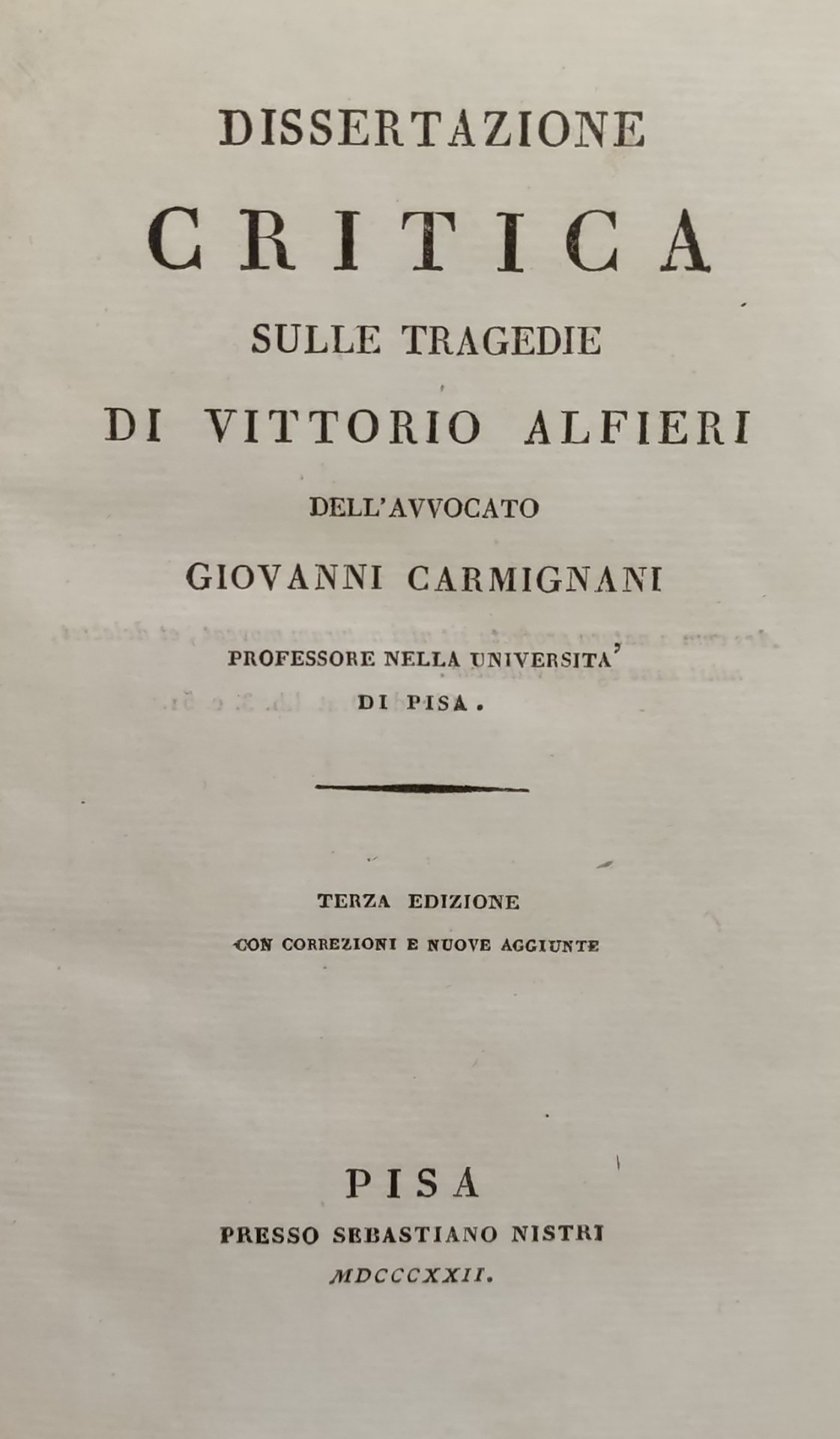 Il testo, pubblicato per la prima volta nel 1806, ottenne da subito un enorme successo. Fu premiato dall'Accademia Napoleone di Lucca e divenne un caposaldo della prima critica alfieriana. Come riportato da Treccani, «il saggio del C. conferiva una voce esplicita a tutto un tessuto di riformismo letterario prudente, sospeso tra neoclassicismo e poetica dei sentimenti, tra riaffermazioni edonistiche del buon gusto e riconoscimenti preromantici dei diritti della passione». in ottavo leg. mezza pelle con piatti marmorizzati, tassello con titolo in oro al dorso, tagli spruzzati pp. 273, (3) Buono (Good) Buon es..