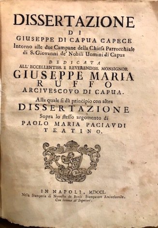 Dissertazione intorno alla due Campane della Chiesa Parrocchiale di S. Giovanni de’ Nobili Uomini di Capua. Alla quale si dà principio con altra Dissertazione sopra lo stesso argomento di Paolo Maria Paciaudi Teatino