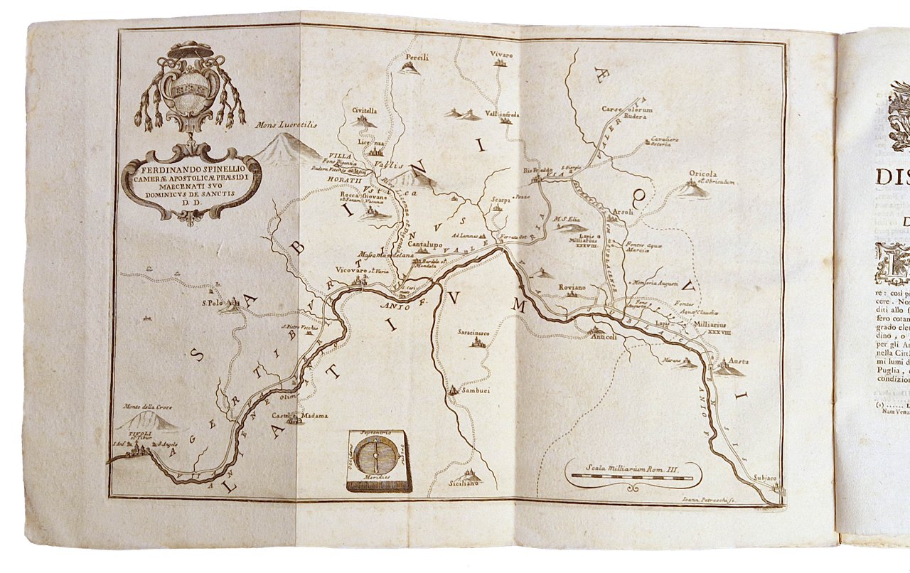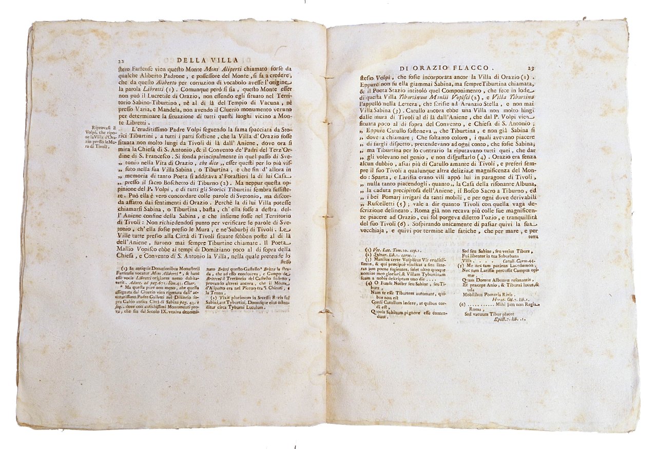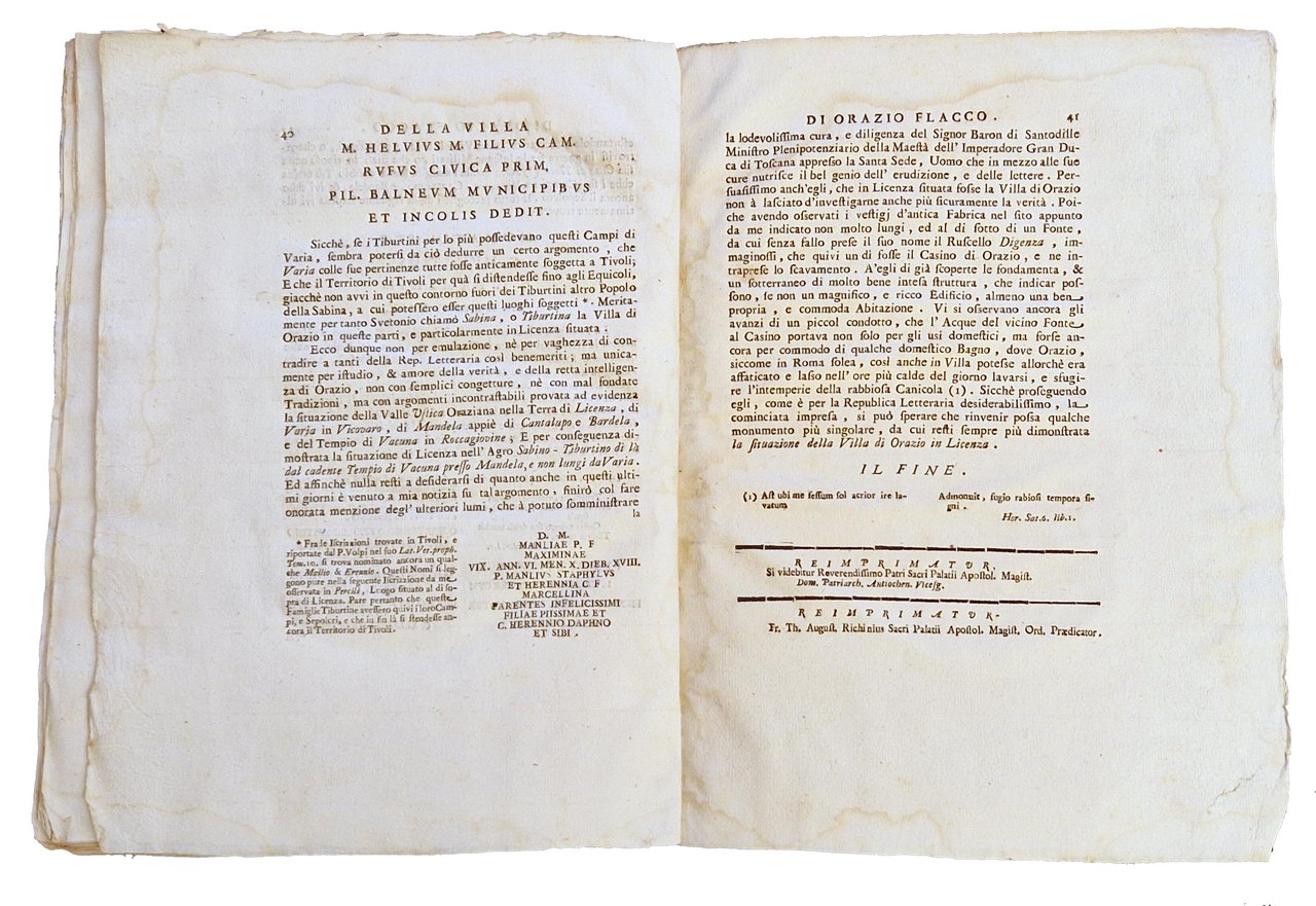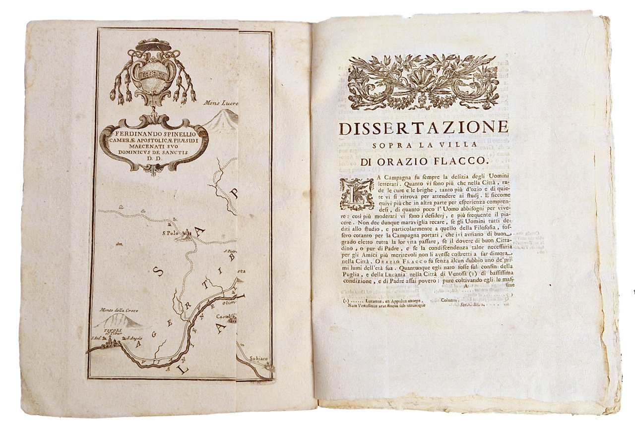 in-4° grande, 300x220 mm, leg. in cartonato leggero rivestito in carta decorata a mano, porzione residua di etichetta cartacea con il titolo, incollata in alto al dorso; pp. 6, 41,[1] c. di tav. più volte ripiegata. Con una grande incisione al frontespizio raffigurante Licenza, nella bassa Sabina. il luogo in cui venne ritrovata la villa del poeta Quinto Orazio Flacco, ricevuta in dono da Mecenate, ed una tavola topografica ripiegata f.t. con lo stemma di Ferdinando Spinelli che rappresenta la Bassa Sabina [Ioann. Petroschi sc.]. Iniziali e testatine xilografiche. Bella seconda edizione di quest'opera di archeologia di Domenico De Sanctis (1721-1798), archeologo e letterato, arciprete della cattedrale di Tivoli, avvocato di Curia, iscritto all'Arcadia con il nome di Falcisco Caristio. Prov.: Piccolo timbro d'appartenenza a inchiostro rosso al frontespizio (corona e iniziali VAG). Rif.: IT\ICCU\SBLE\005385. OCLC, 634664060. Cond.: Lievi tracce d'uso alla legatura (leggera scoloritura della carta e limitate abrasioni ai bordi). Testo marginoso, su carta forte. Pagine parzialmente in barbe. Presenza di aloni d'umido ai margini di alcune carte. Esemplare molto buono.