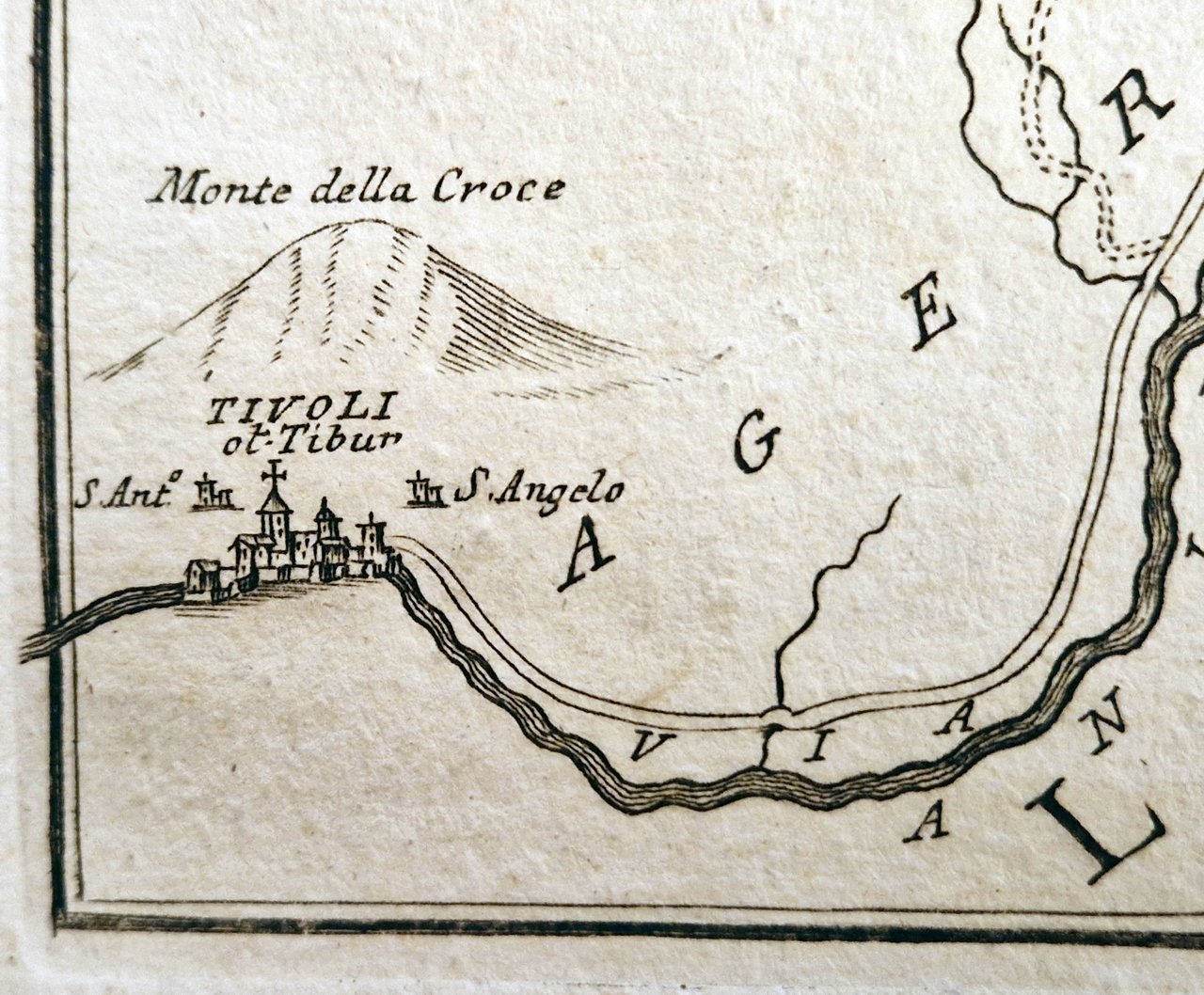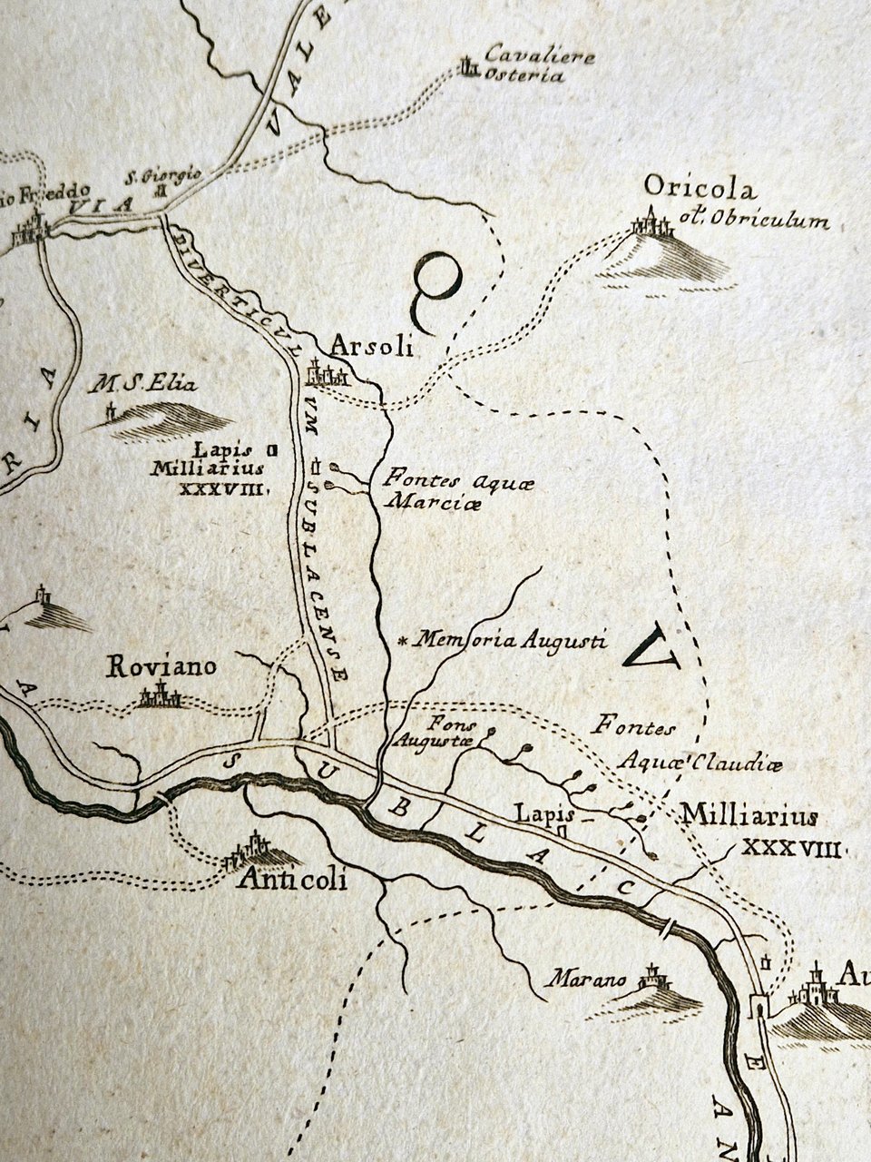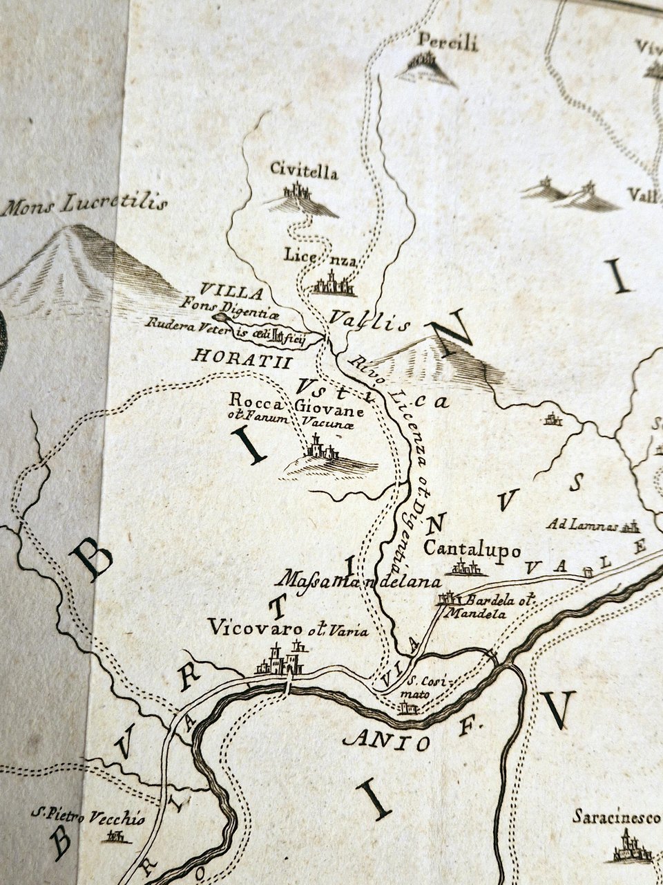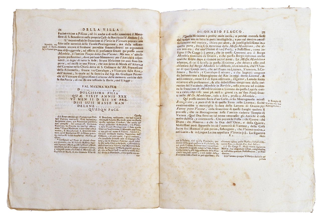 in-4° grande, 300x220 mm, leg. in cartonato leggero rivestito in carta decorata a mano, porzione residua di etichetta cartacea con il titolo, incollata in alto al dorso; pp. 6, 41,[1] c. di tav. più volte ripiegata. Con una grande incisione al frontespizio raffigurante Licenza, nella bassa Sabina. il luogo in cui venne ritrovata la villa del poeta Quinto Orazio Flacco, ricevuta in dono da Mecenate, ed una tavola topografica ripiegata f.t. con lo stemma di Ferdinando Spinelli che rappresenta la Bassa Sabina [Ioann. Petroschi sc.]. Iniziali e testatine xilografiche. Bella seconda edizione di quest'opera di archeologia di Domenico De Sanctis (1721-1798), archeologo e letterato, arciprete della cattedrale di Tivoli, avvocato di Curia, iscritto all'Arcadia con il nome di Falcisco Caristio. Prov.: Piccolo timbro d'appartenenza a inchiostro rosso al frontespizio (corona e iniziali VAG). Rif.: IT\ICCU\SBLE\005385. OCLC, 634664060. Cond.: Lievi tracce d'uso alla legatura (leggera scoloritura della carta e limitate abrasioni ai bordi). Testo marginoso, su carta forte. Pagine parzialmente in barbe. Presenza di aloni d'umido ai margini di alcune carte. Esemplare molto buono.
