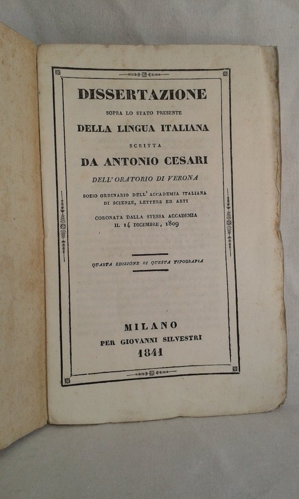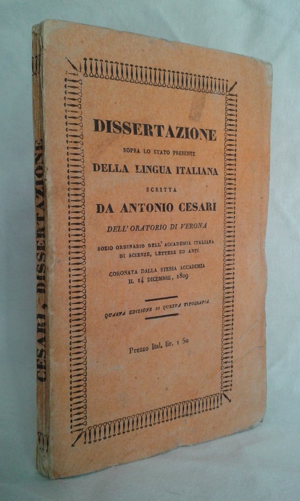 Volume in 12, brossura editoriale, titolo al piatto ed al dorso, frontespizio, 118 pp. Interessante e profonda dissertazione sulla lingua e letteratura italiana, a difesa del Volgare nella forma ad esso data dai Grandi, con programma esposto all'Accademia per l'anno 1808, gli scrittori trecentisti, Boccaccio, Dante, Petrarca, le propriet dei vocaboli, le ricchezze della lingua. A parte le ininfluenti mende d'uso alla legatura, in perfetto stato. In barbe ed intonso.