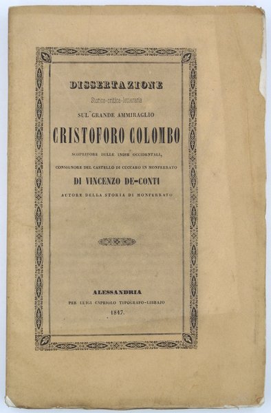 DISSERTAZIONE STORICO-CRITICA-LETTERARIA SUL GRANDE AMMIRAGLIO CRISTOFORO COLOMBO SCROPRITORE DELLE INDIE OCCIDENTALI E CONSIGNORE DEL CASTELLO DI CUCCARO IN MONFERRATO. DI VINCENZO DE-CONTI AUTORE DELLA STORIA DI MONFERRATO. ALESSANDRIA PER LUIGI CAPRIOLO TIPOGRAFO-LIBRAJO 1847.