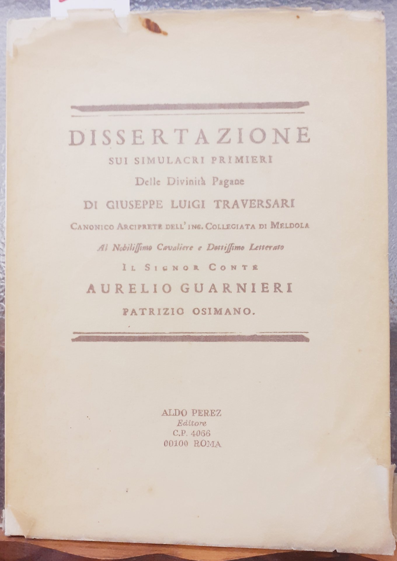 DISSERTAZIONE SUI SIMULACRI PRIMIERI DELLE DIVINITA' PAGANE di GIUSEPPE LUIGI TRAVERSARI, Canonico Arciprete deLL'Ins. Collegiata di Meldola. Al nobilissimo Cavaliere e Dottissimo Letterato il signor Conte Aurelio Guarnieri, patrizio osimano.