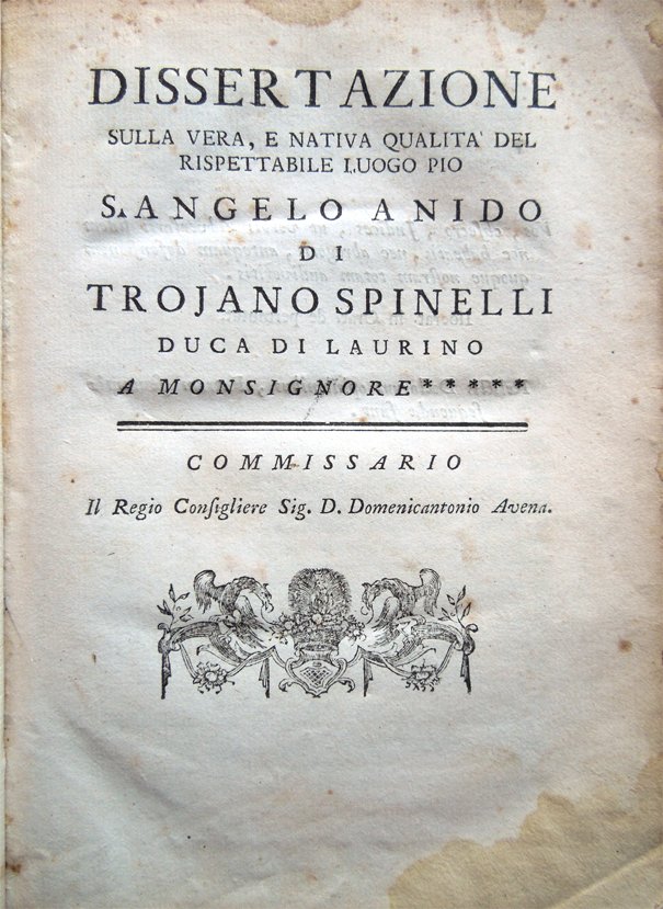 Dissertazione sulla vera, e nativa qualità del rispettabile luogo pio S. Angelo a Nido di Trojano Spinelli Duca di Laurino a Monsignore *****. Commissario il Regio Consigliere Sig. D. Domenicantonio Avena