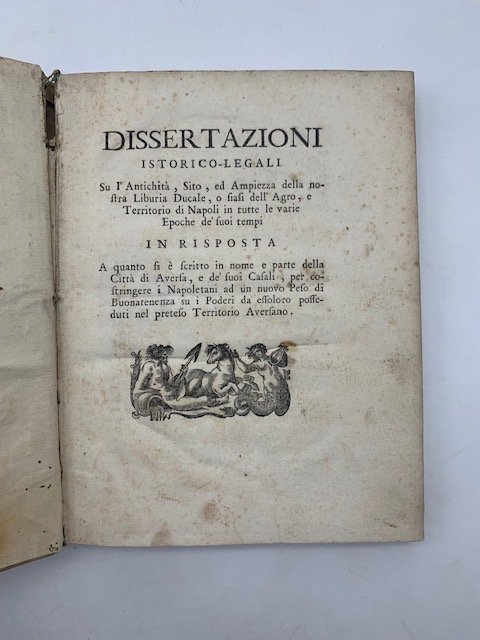 In 8 (cm 17,5 x 23,5), pp. CCXXXV + (1 bianca). Legatura coeva in piena pergamena con minimi forellini di tarlo ai margini interni dei piatti e alle due carte di sguardia iniziale e finale. Edizione originale, rara, di questa monografia storica sulla Liburia Ducale (ovvero Terra di Lavoro) e Agro napoletano pubblicata senza dati editoriali (il nome dell'Autore, il luogo e la data si desumono da pagina CCXIX). L'opera fa parte di una serie di tre studi che Carlo Franchi dedico' a questo territorio. Le altre due sono: 'Su l'origine sito e territorio di Napoli' e 'Breve ristretto di ragioni per la fedelissima citta' di Napoli contro la citta' di Aversa'. "Non abbiamo opera ne' piu' erudita, ne' piu' critica sulle antiche cose della nostra patria di quella del nostro veramente dottissimo Franchi. Ragiona nella prima dell'origine della Citta' di Napoli, del suo sito e primo territorio, della sua estensione in tempo de' Goti, parla della Citta' di Atella e del suo territorio utile al Napoletano dopo la sua distruzione, dimora qual fosse stata l'estensione del territorio napoletano fotto i Duchi, favella della Citta' di Aversa, e pruova che il sito, in cui fu edificata, e le terre donate in Oftabo, erano del tenimento di Napoli, e va finalmente a conchiudere, che il territorio Aversano non fu giammai diviso dal Napoletano" ("La Biblioteca storica, e topografica del Regno di Napoli di Lorenzo Giustiniani", 1793, p. 123) Platneriana, p. 230. Dura, 5675. Catalogo dei libri appartenuti al fu Don G. Selvaggi, p. 117. Bibliotheca Maphaei Pinellii Veneti, 1226.