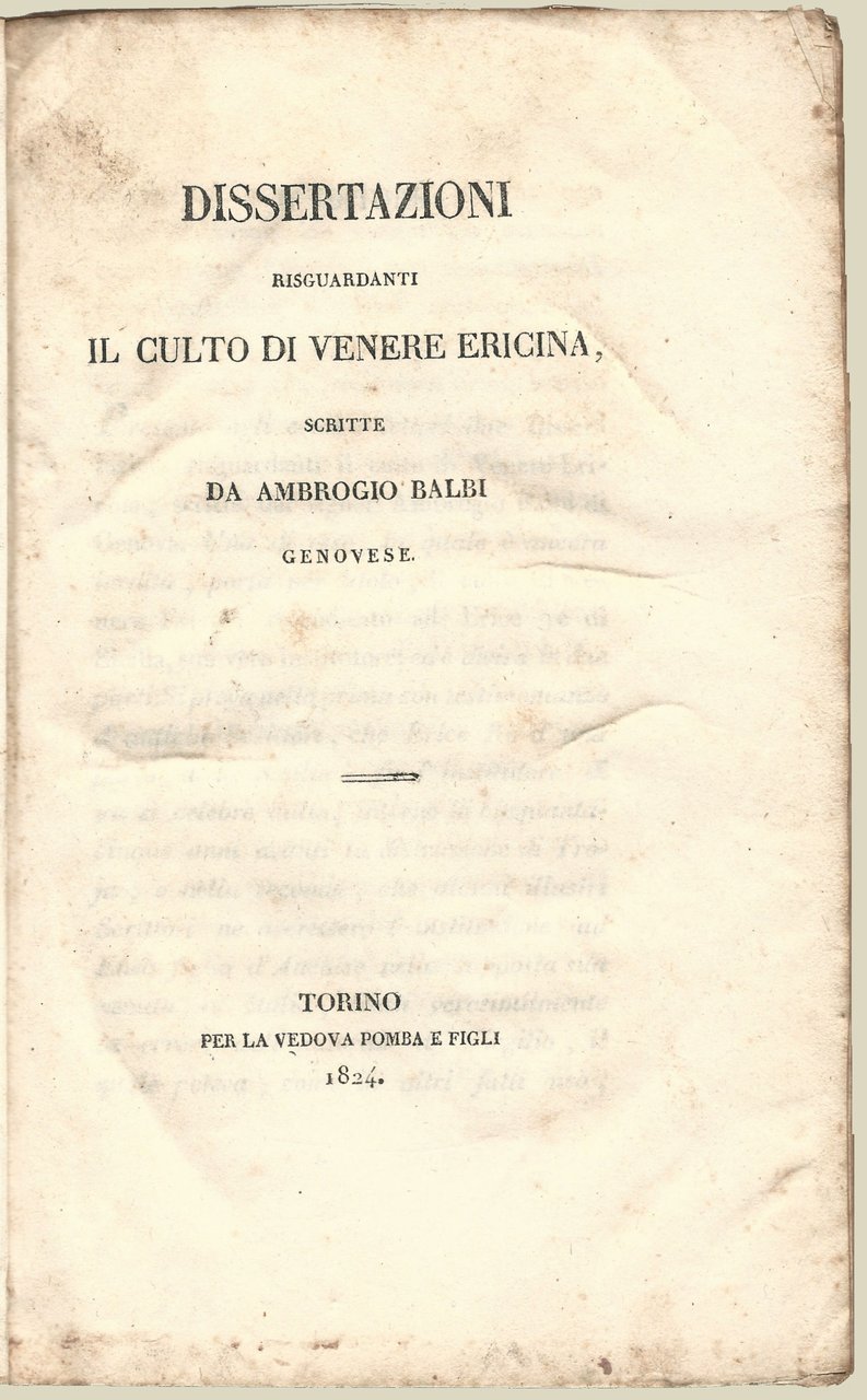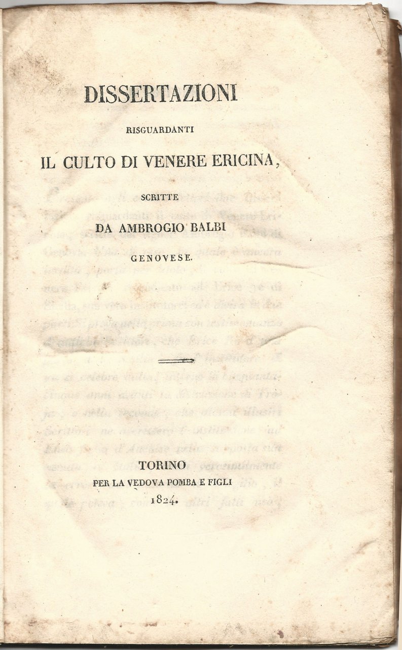 In 8, p. 90, br. orig. muta. - Contiene: "Il culto di Venere ericina rivendicato ad Erice re di Sicilia suo vero istruttore" e "Dissertazione sopra una lapide inscritta da Silla a Venere ericira".