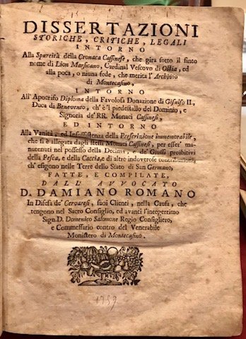 Dissertazioni storiche, critiche, legali intorno alla spureità della Cronaca Cassinese, che gira sotto il finto nome di Lion Marsicano, Cardinal Vescovo di Ostia, ed alla poca, o niuna fede, che merita l’Archivio di Montecassino, intorno all’Apocrifo Diploma della Favolosa Donazione di Gisulfo II, Duca di Benevento, ch’è ‘l piedestallo del Dominio, e Signoria de’ RR. Monaci Cassinesi, ed intorno alla Vanità, ed Insussistenza della Prescrizione immemorabile, che si è allegata dagli stessi Monaci Cassinesi, per esser’ mantenuti nel possesso della Decima, e de’ Giussi proibitivi della Pesca, e della Caccia, e dialtre indoverose contribuzioni, ch’esigono nelle Terre dello Stato di San Germano.