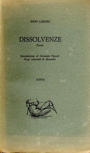 Dissolvenze, prima edizione aprile 1969, pp. 69, formato 13,5 x 22,5.<BR>Copertina morbida di colore verde, con piccola illustrazione al piatto anteriore di Giuseppe Mazzullo. Titoli in nero. Collana diretta da Giovanni Passeri. Grafica e impaginazione di Giovanni Semerano. Tiratura limitata in 1000 copie. In antiporta presente dedica dell'autore, datata 15 maggio 1969. <BR>Bruniture ai piatti. Nel complesso condizioni molto buone.