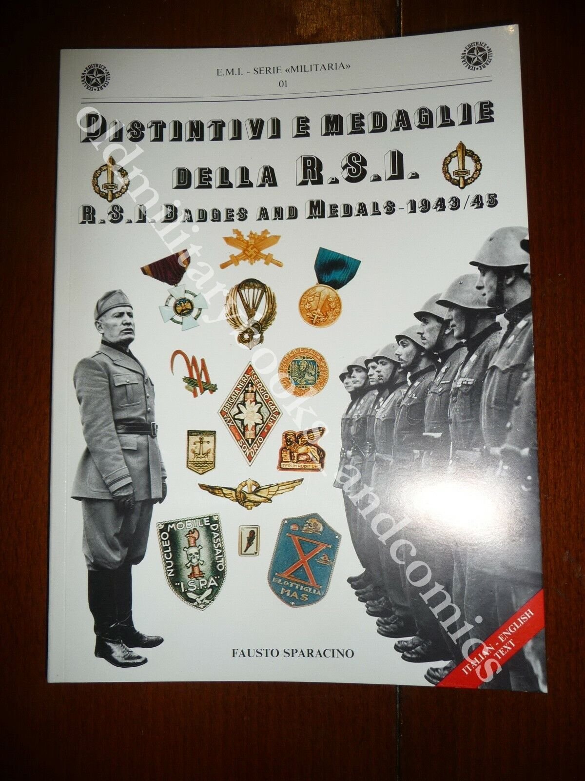 DESCRIZIONE: E.M.I. Serie "Militaria" Milano 1988 br. ed. ill. pp. 96 completamente ill. con foto b/n e col. in 8° g. Volume bilingue Italiano/Inglese.Bella opera che seppur non esaustiva sull'argomento presenta delle bellissime foto e dei rari materiali, che provengono sia dall'A. che dai più grossi collezionisti italiani del settore, il Gotha della RSI e della Decima MAS. Il vol. illustra e descrive, attraverso chiare immagini fotografiche a grandezza naturale, gran parte dei " pezzi " sino ad oggi rinvenuti che si riferiscono a distintivi, fregi, scudetti, medaglie ed onorificenze prodotti durante i 600 giorni della R.S.I.Indice completo in foto.CONDIZIONI DELL'OGGETTO: Ottime/Perfette.PESO/WEIGHT: 397 g without package