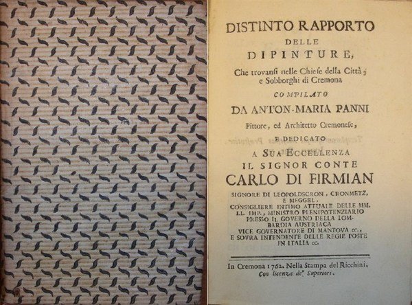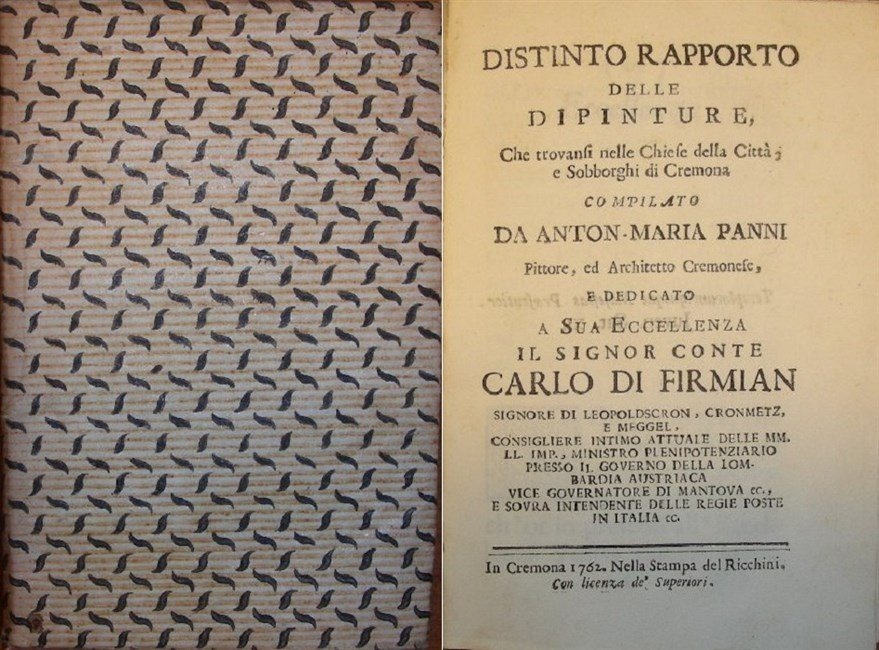 in-8, pp. XXIV, 214, (2), bella leg. remondiniana cartone dec. Prima e unica rara ediz. dell’architetto Panni (Cremona 1730-1790), che fu anche storico della sua città natale. Nel suo saggio sono contenute le descrizioni dei dipinti romanici delle principali cattedrali, oltre a fornire informazioni circa i maggiori artisti attivi a Cremona: i Campi, Parmigianino, Boccaccino, Tiziano, Morazzone, Palma il vecchio. Schlosser 532: “Cremona, la città dei liutai, vanta due guide antiche: la prima è di un architetto pittore, Anton Maria Panni (1762), anche questa con introduzione sulle questioni della cura e della conservazione dei dipinti; il rimanente è occupato dalla cinque giornate che il coscienzioso autore chiede al suo “forestiere” che si affida alla sua guida.”. Cicognara 4190. Lozzi 1400. Fossati Bellani 2129. Perfetto esempl. [313]