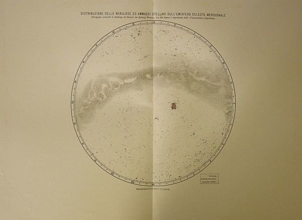 Distribuzione delle nebulose ed ammassi stellari sull'emisfero celeste meridionale. Tratto da "L'universo stellato. Trattato di astronomia popolare" del dott. M. Guglielmo Meyer.