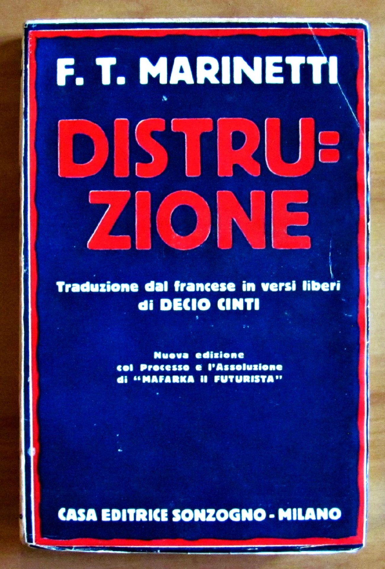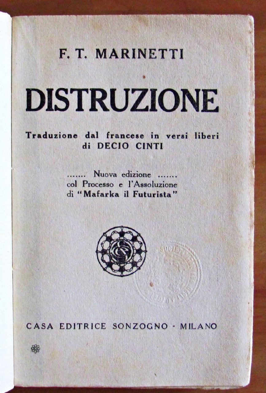 12x18,5; pp.345. Brossura editoriale. Nuova Edizione col Processo e l'Assoluzione di ?Mafarka il Futurista?. Traduzione dal francese in versi liberi di Decio Cinti. Ottimo stato. , Ottimo (Fine)