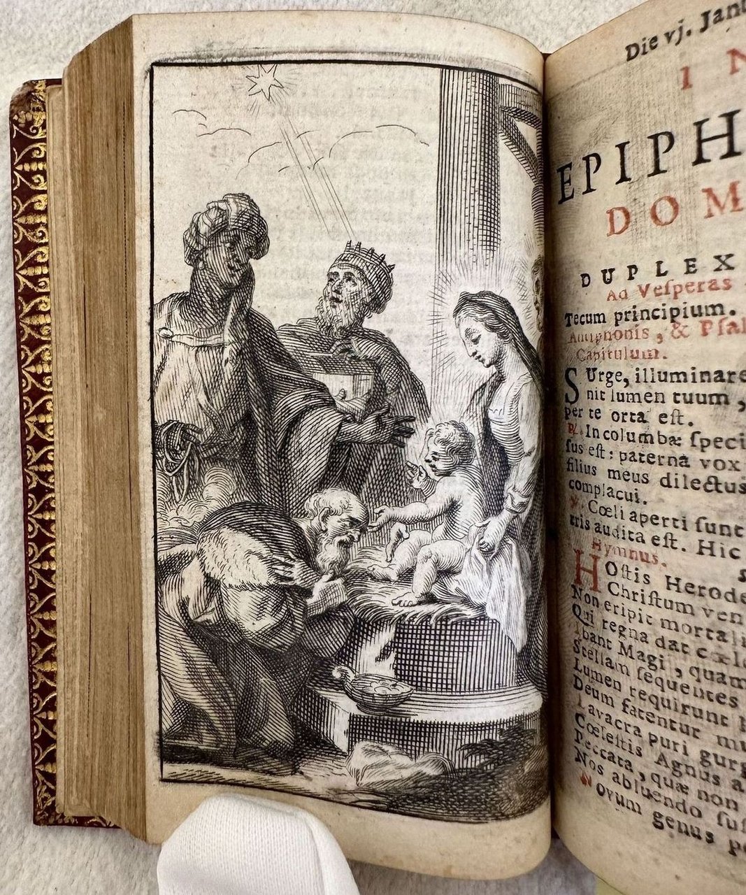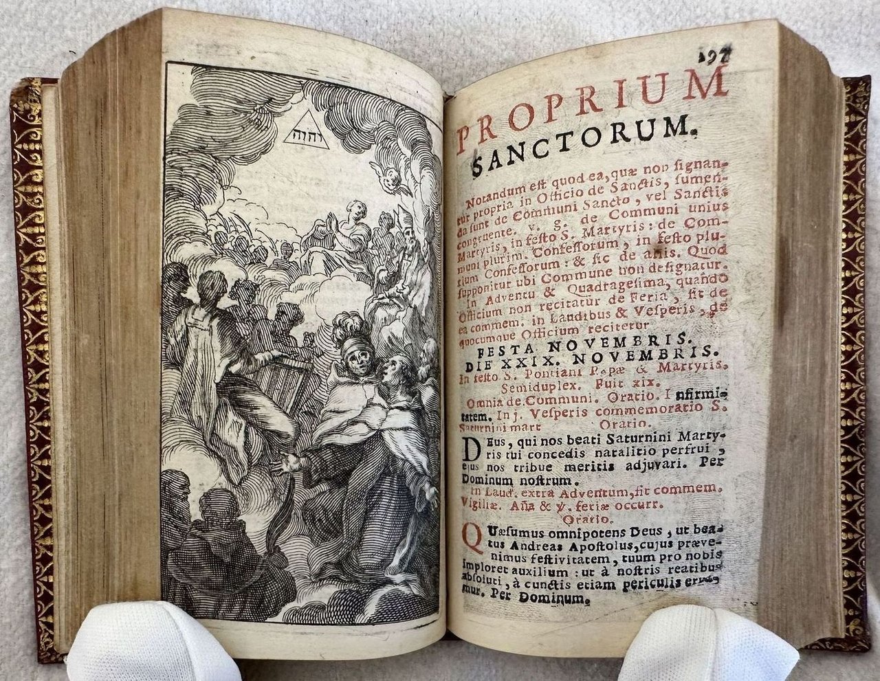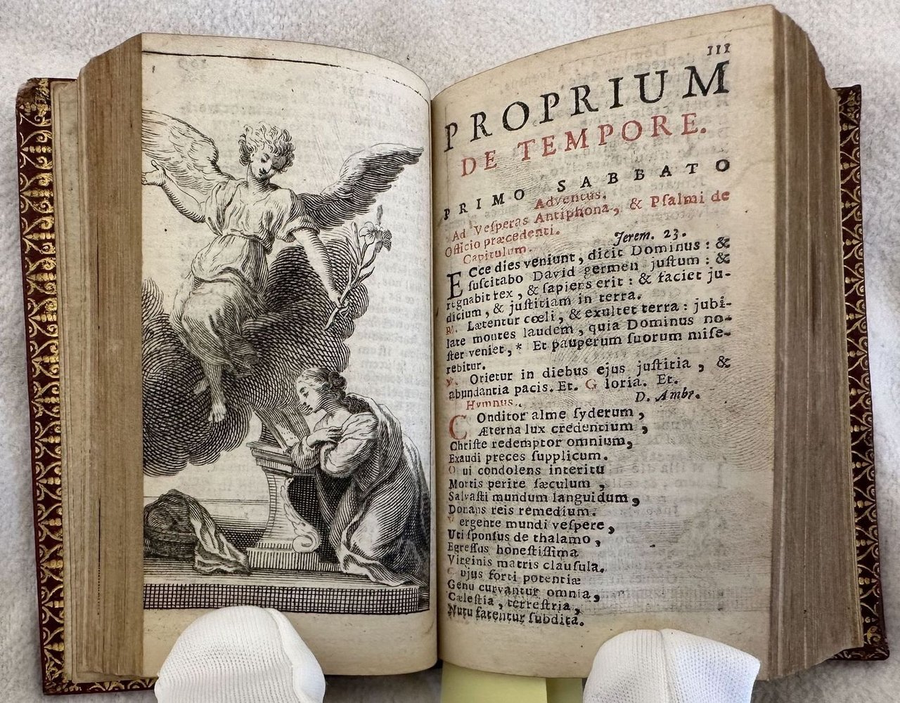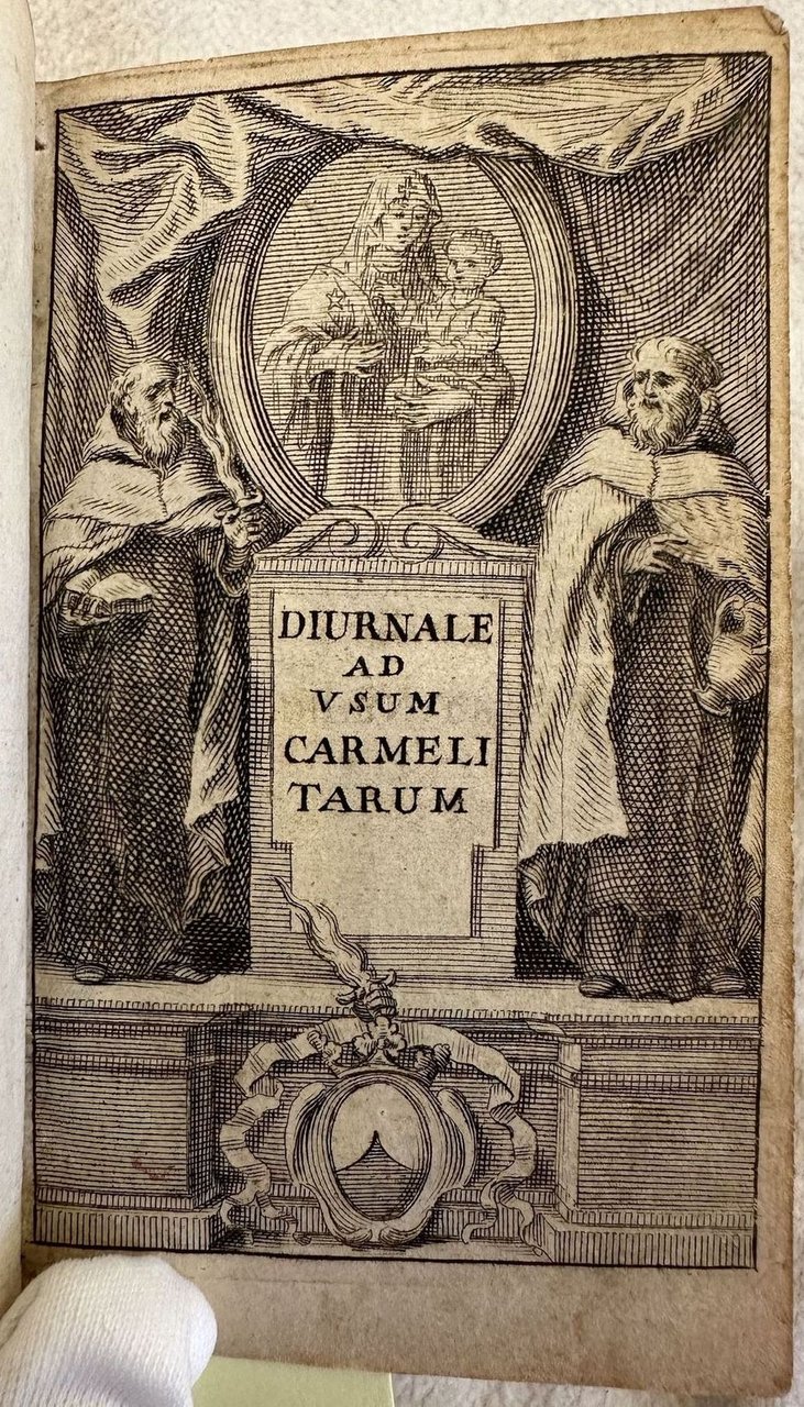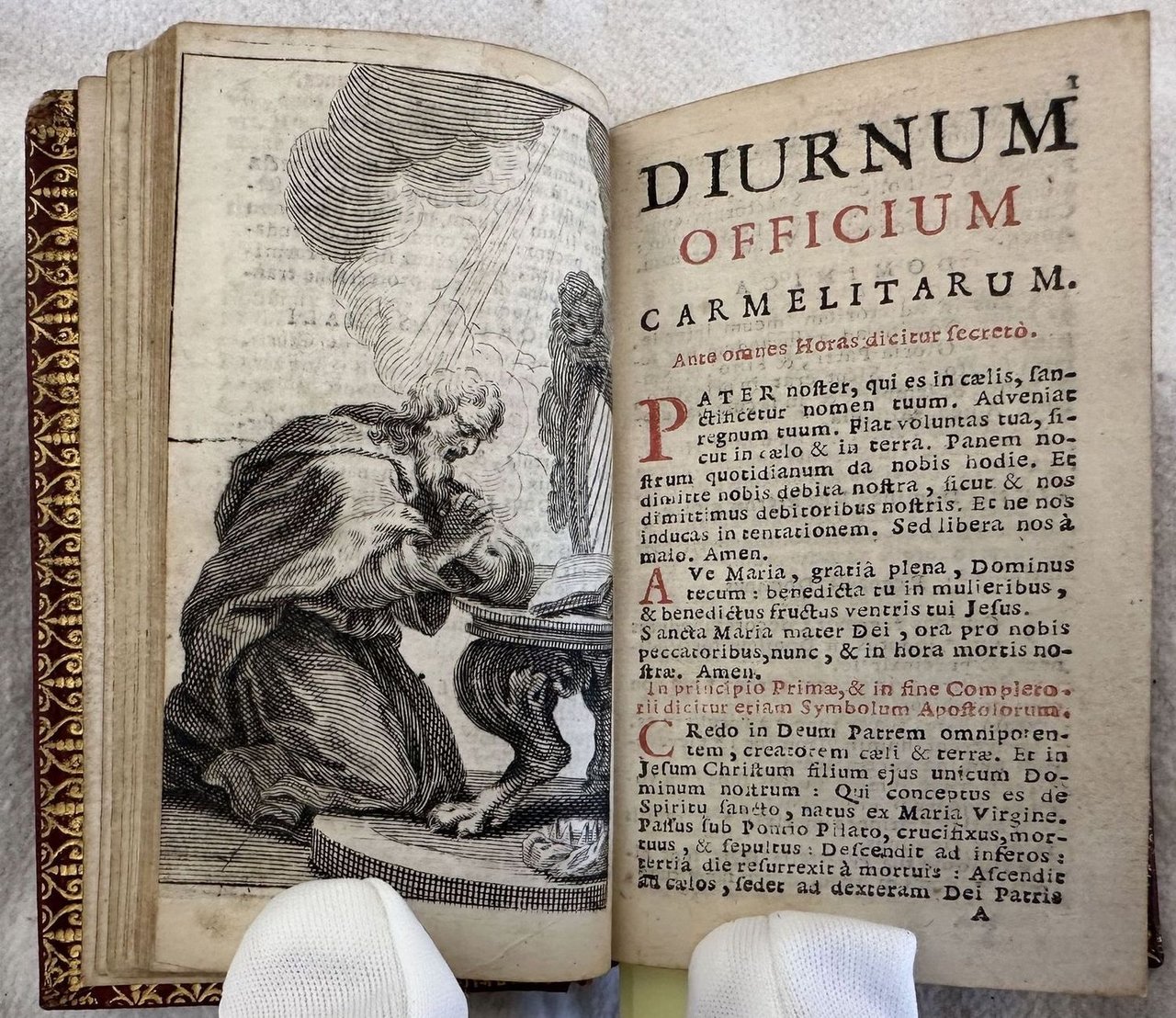 Rarissima opera liturgica del 1693, un diurno dell'Ordine dei fratelli della Beata Vergine del Monte Carmelo. Le origini del rito carmelitano risalgono alla liturgia gallicano-romana portato in Terra Santa dai crociati. Venne rinnovato nel 1312 dal carmelitano tedesco Siberto di Beka fino al 1956 quando la Santa Sede impose all'ordine di scegliere definitivamente tra rito romano e carmelitano. Dal 1972 l'ordine utilizza il Rito Romano. Frontespizio figurato e sette finissime incisioni a piena pagina impreziosiscono il testo tra cui l'annunciazione, la natività, l'arrivo dei Re Magi, la Resurrezione, I Santi, La Beata Vergine del Monte Carmelo. Alla fine del volume tredici fogli bianchi. Antica nota manoscritta alla prima carta bianca. Sguardie marmorizzate. In ottime condizioni. Copertina in marocchino rosso coeva con titolo e ricche decorazioni in oro al dorso e piatti n ottime condizioni generali con lievi usure marginali. Legatura in buone condizioni. All'interno le pagine si presentano in buone condizioni con rare fioriture. In 32. Dim. 10x6x3,5 cm. Pp. (8)+416. Peso gr. 150.Very scarce liturgical work of 1693, a diurnum of the Ordine dei fratelli della Beata Vergine del Monte Carmelo. The origins of carmelitan rhyte belongs to gallican roman liturgy and the rhyte was renewed in 1312 byt he german carmilitan Siberto di Beka until 1956 when the Santa Sede imposed to the Order to choose definetevely between carmilitan and roman rhyte. From 1972 the order uses roman rhyte. Figurated title page and seven full page very fine engravings enrich the text. Between them the annunciarion, naticity, arrival of Re Magi, resurrections, Saints, The Blessed Virgin of Mount Carmelo. At the end of the volume there are 13 blank pages. Antique handwritten note in the first endpage. Marbled counterplates. In very good conditions. Red morocco coeval cover with gilted title in the spine and rich gilted decorations in very good general conditions lightly worn and lackings in the extremities. Binding in good conditions. Inside pages are in good conditions with occasional foxing. Pages from 179 and 181 have been bound in the contrary.In 32. Dim. 10x6x3,5 cm. Pp. (8)+416. Peso gr. 150.