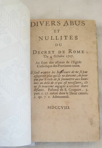Rara opera del 1708, una critica al decreto di Roma del 4 ottobre 1707 in merito alla questione della Chiesa Cattolica nelle Province-Unite. L'opera è anonima ma attribuita al teologo giansenista Pasquier Quesnel (1634-1719) molto attivo nel dibattito contro il giansenismo in Francia. Arrestato nel 1703 a Bruxelles riuscì a fuggire ad Amsterdam dove si stabilì definitivamente. In ottime condizioni e completo. Copertina morbida moderna in ottime condizioni generali. Legatura in buone condizioni. Pagine in buone condizioni con fioriture. segno manoscritti a matita. In 16. Dim. 16,5x10,5 cm. Pp. 234+(6).