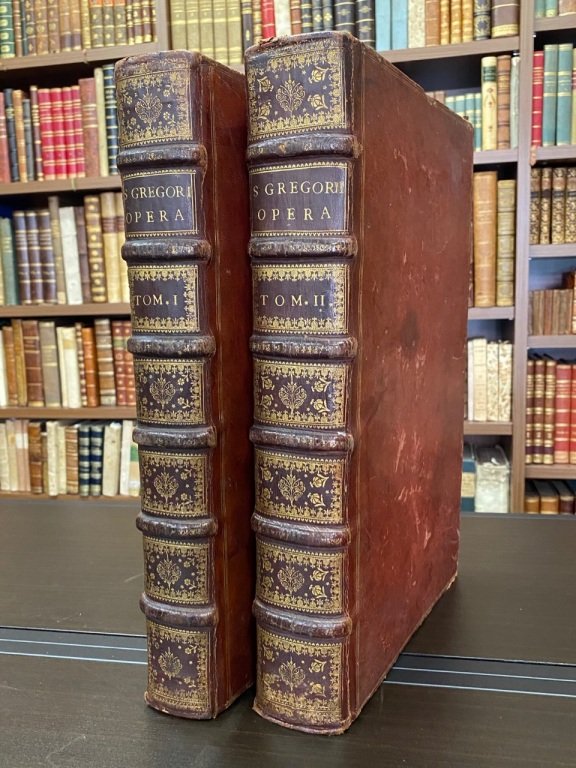 <span style="font-style: normal;"><span style="font-style: normal;">2 volumi in-folio (cm. 38,4), legature del secolo successivo in piena pelle granata (lievi tracce d'usura) con titolo e fregi floreali arabescati in oro ai comparti dei dorsi, piatti inquadrati in cornice di triplice filetto, labbri e unghie con </span><i>dentelles</i>, tagli dorati, risguardi marmorizzati; cc. XXVIII, coll. 1414; coll. 1656, cc. 58 in ottimo stato e crocchianti, con grandi marche della <i>Compagnie de la Grand'Navire</i> ai frontespizi (vascello della città di Parigi con iniziali e gigli); frontespizi in rosso e nero con antiche note di appartenenza (una, visibile al primo, è occultata al secondo frontespizio da una striscia di carta antica); qualche lievissima fioritura e un piccolo segno di tarlo al margine bianco del solo ultimo fascicolo del secondo tomo. Edizione curata da Jean Gillot, umanista che si dedicò alla patristica e finì la sua vita cistercense. Cfr. Benoit Gain, </span><i>Un humaniste méconnu: Jean Gillot, éditeur des Pères</i>, in <i>Auctoritas patrum: zur Rezeption der Kirchenväter im 15. und 16. Jahrhundert</i>, ed. Leif Grane, Alfred Schindler, and Markus Wriedt, Mainz 1993, pp.15-19. Ottimo esemplare. (SG6)