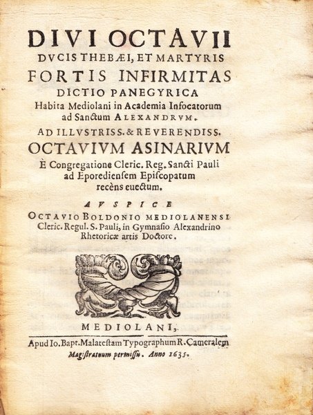 Divi octavii ducis thebaei, et martyris fortis infirmitas dictio panegyrica Habita Mediolani in Academia Infocatrum ad Sanctum Alexandrum. Ad illutris. & Reverendiss. Octavium Asinarium e Congregatione Cleric. Reg. Sancti Pauli ad Eporediensem Episcopatum recens euectum auspice Octavio Boldonio mediolanense Cleric. Regul. S. Pauli, in Gymnasio Alexandrino Rhetoricae artis Doctore. Ottavio Boldoni, Ottavio Asinari.