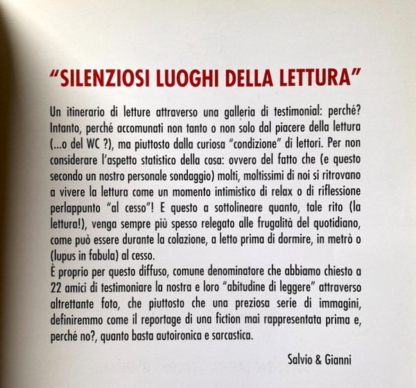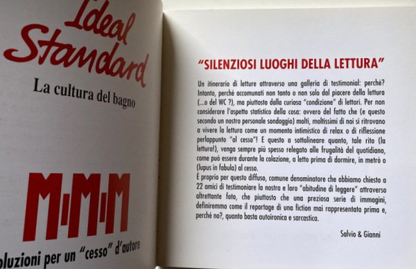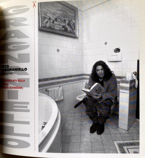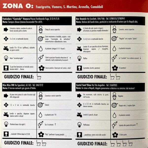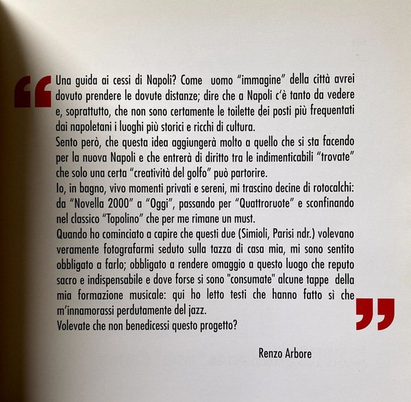 Soggetti: Personaggi illustri, Napoletani, Cessi, Bagni pubblici, Letture, Lettura, Gabinetti, Bar, Locali, Guide locali, Viaggio, Vademecum, Giudizio, Recensioni, Bagno, Fotografie, Foto d'epoca, Artisti, Registi, Attori, Libri Vintage Fuori catalogo, Libri rari, Chicche librarie, Anni Novanta, Stazione, Ristoranti, Musei, Pulizia, WC, Toilette napoletane, Water, Vip, Renzo Arbore, Enzo, Gragnaniello, Iaia Forte, Enzo Moscato, 99Posse, Peppe Lanzetta, Pappi Corsicato, Leggere, Ciro Sabatino, Pino Daniele, Antonio Bassolino, Centro storico, Lungomare, Posillipo, Chiaia, Mergellina, Sannazaro, Garibaldi, Reportage, Racconti, Narrativa, Storie, Cultura locale partenopea, Curiosità, Aneddoti, Ideal Standard, Bagno, Testimonial, Quotidiani, Romanzi, Abitudini, Ironia, Sarcasmo, Cristina Donadio, Leopoldo Mastelloni, Ernesto Esposito, Francesco Paolantoni, Annie Papa, Blues, Jazz, Radio, Radiazza, Vomero, Funicolare, Gambrinus, Caffè storici, Fuorigrotta, Trianon, Scarlatti, Bar Augusto, Galano, Bersagliera, Santa Lucia, Castel dell'Ovo, Zi Teresa, Hotel Parker's, Lavabo, Specchio, Condizioni, Suor Orsola Benincasa, Max Montana, Umberto Manzo, Angels of Love, Pietro Del Vaglio, Pietra Montecorvino, Famous people, Neapolitans, Toilets, Public toilette, Readings, Reading, Bars, Local, Local guides, Travel, Judgment, Reviews, Bathroom, Photographs, Vintage photos, Artists, Directors, Actors, Out of print books, Rare books, Book goodies, Nineties, Station, Restaurants, Museums, Cleaning, Neapolitan Toilets, Read, Old Town, Lungomare, Tales, Fiction, Stories, Neapolitan local culture, Curiosity, Anecdotes, Bathroom, Testimonial, Newspapers, Novels, Habits, Irony, Sarcasm, Funicular, Historic Cafes, Washbasin, Mirror, Conditions, Collezionismo, Da collezione, Collectibles