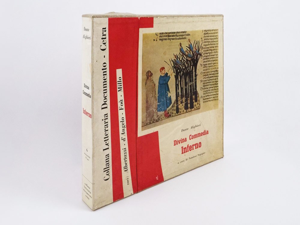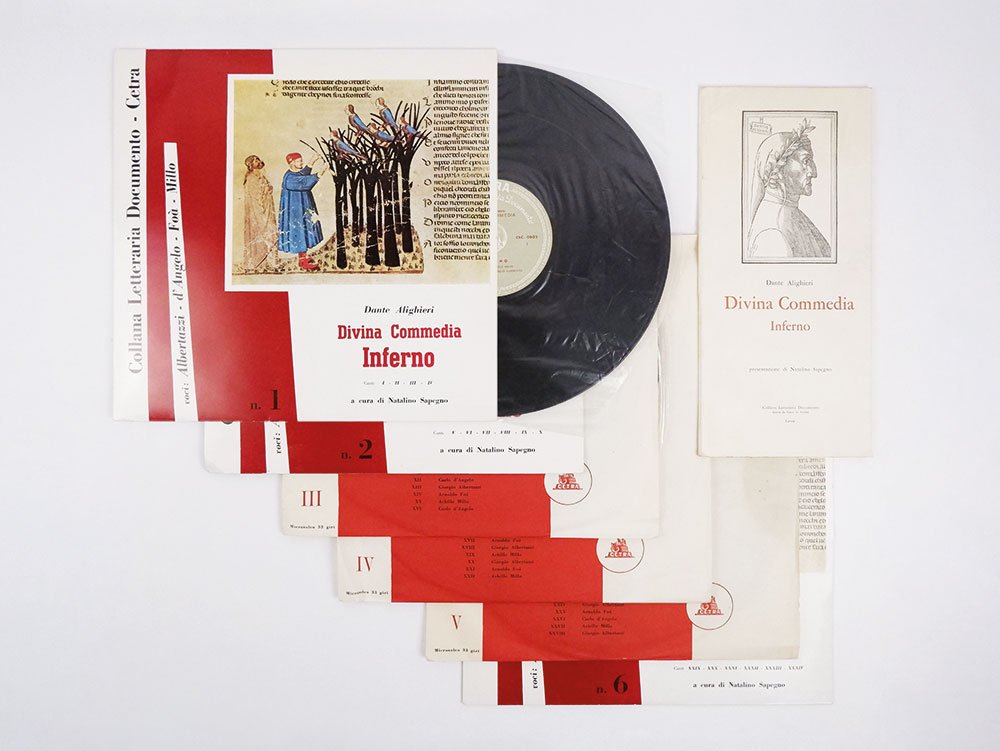 EPHEMERAPrima edizione.Insieme in ottime condizioni di conservazione (normali segni d’usura ai bordi dell’astuccio, con una cerniera separata, senza che sia pregiudicata la solidità complessiva).Raro insieme completo dei sei dischi nel grande astuccio in cartonato e tela, accompagnati dal libretto curato da Natalino Sapegno con sinossi e brevi commenti per ciascun canto dell’«Inferno». Voci narranti di Giorgio Albertazzi, Carlo D’Angelo, Arnoldo Foà e Achille Millo. Una sola copia registrata in ICCU, in una biblioteca locale. -- Fondamentale documento sulla lettura dantesca: le voci degli attori per questi canti sono diventate per molti versi canoniche, seguite negli anni da quelle di Gassman e Benigni. Importante uscita della «Collana letteraria Documento», diretta da Nanni de Stefani per la casa discografica Cetra, che pubblicò numerosi dischi in cui grandi attori leggevano alcuni dei più noti autori del canone letterario italiano, in particolare tra gli anni cinquanta e sessanta. -- Fa riferimento a quest’edizione un personaggio di Sciascia, il professor Roscio di «A ciascuno il suo» (1966): «Erano le cinque del pomeriggio. Il professore stava in terrazza, seduto in poltrona, un giradischi a lato da cui veniva ora stentorea ora tremula e sospirata la voce di un attore famoso che declamava il trentesimo dell’Inferno. “Vede come sono ridotto? ” disse il professore porgendogli la mano “A sentire da costui la ‘Divina Commedia’” quasi che l’attore fosse presente e che il professore avesse altre e più personali ragioni per disprezzarlo. “Preferirei me la leggesse mio nipote, che ha dodici anni, o la cameriera, o il portiere: ma hanno altro da fare”».